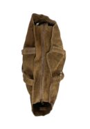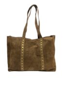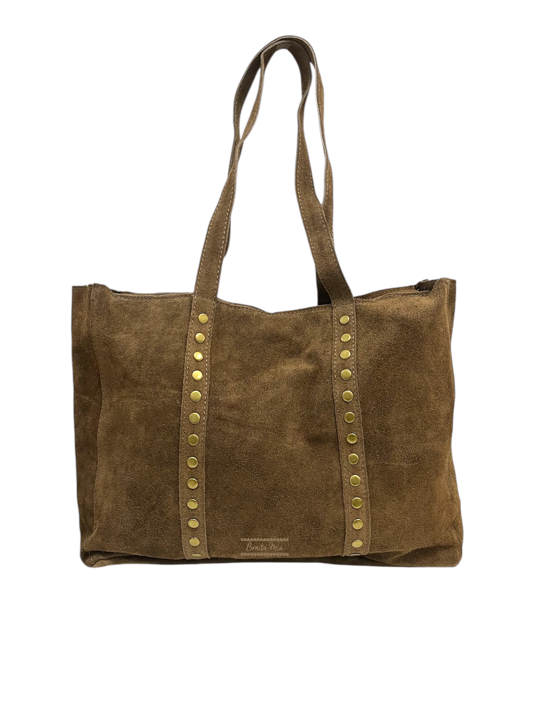 Bolso de piel marrón chocolate estilo shopper con tachas doradas.