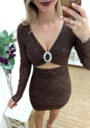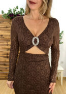 Vestido corto de encaje marrón chocolate con cut out en la cintura, fruncidos laterales y detalle de joya. Lleva forro interior y cascos.