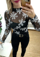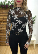 Top de tul negro con bordado floral en blanco. Incluye top interior con cascos