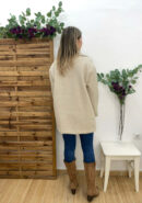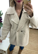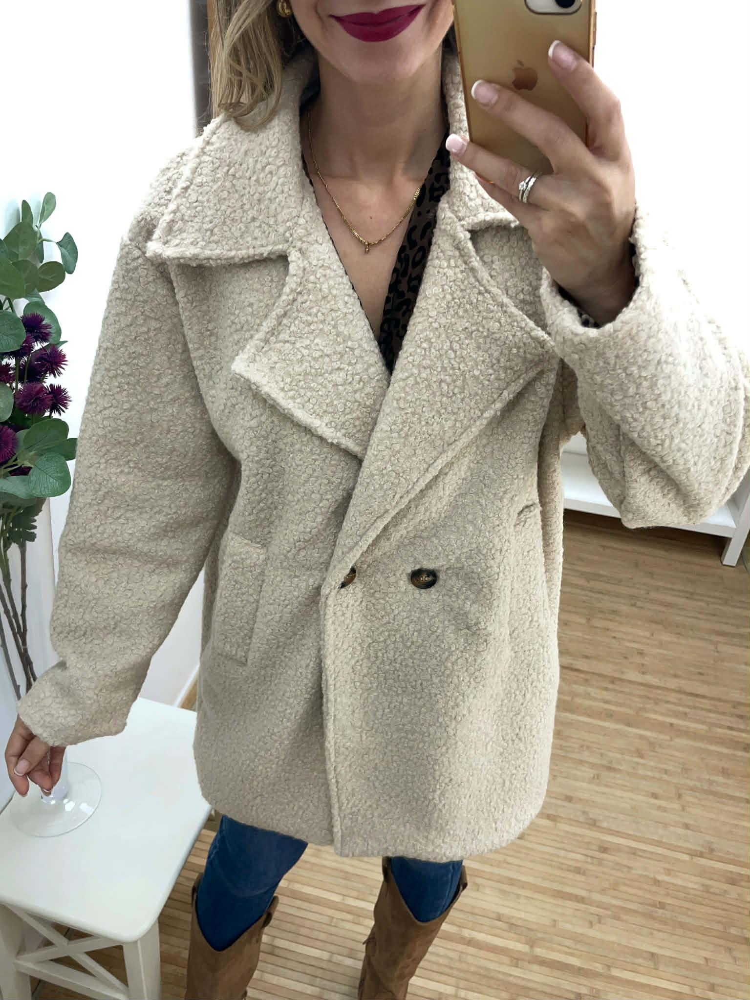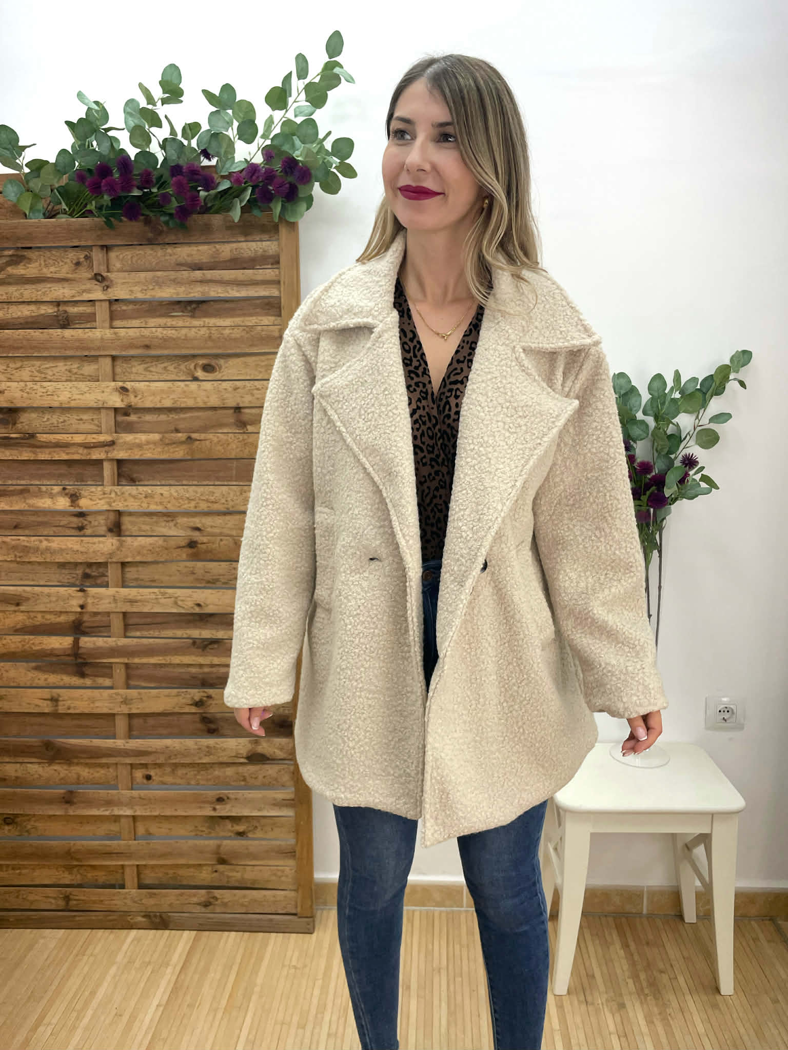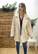 Abrigo oversize en color beige de borreguillo con forro en estampado de leopardo, botón para cerrar y bolsillos en ambos laterales.