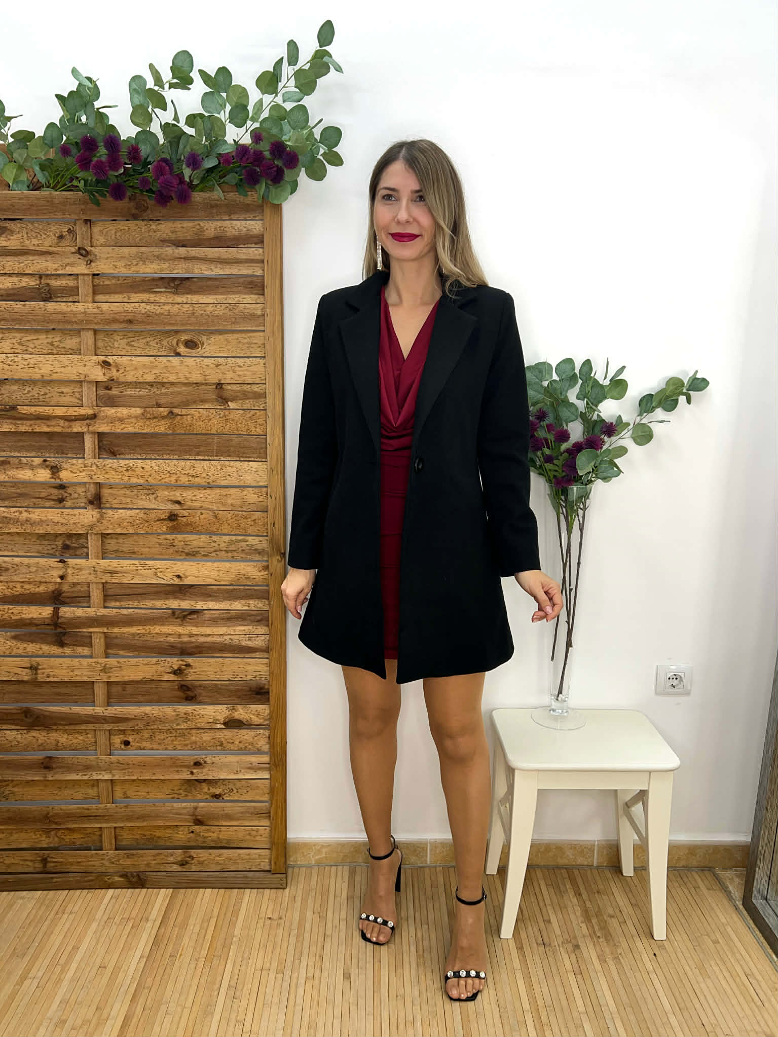 Abrigo de paño en color negro con bolsillos en ambos laterales y botón negro.