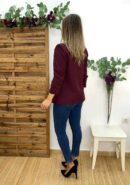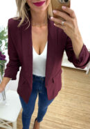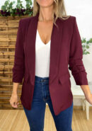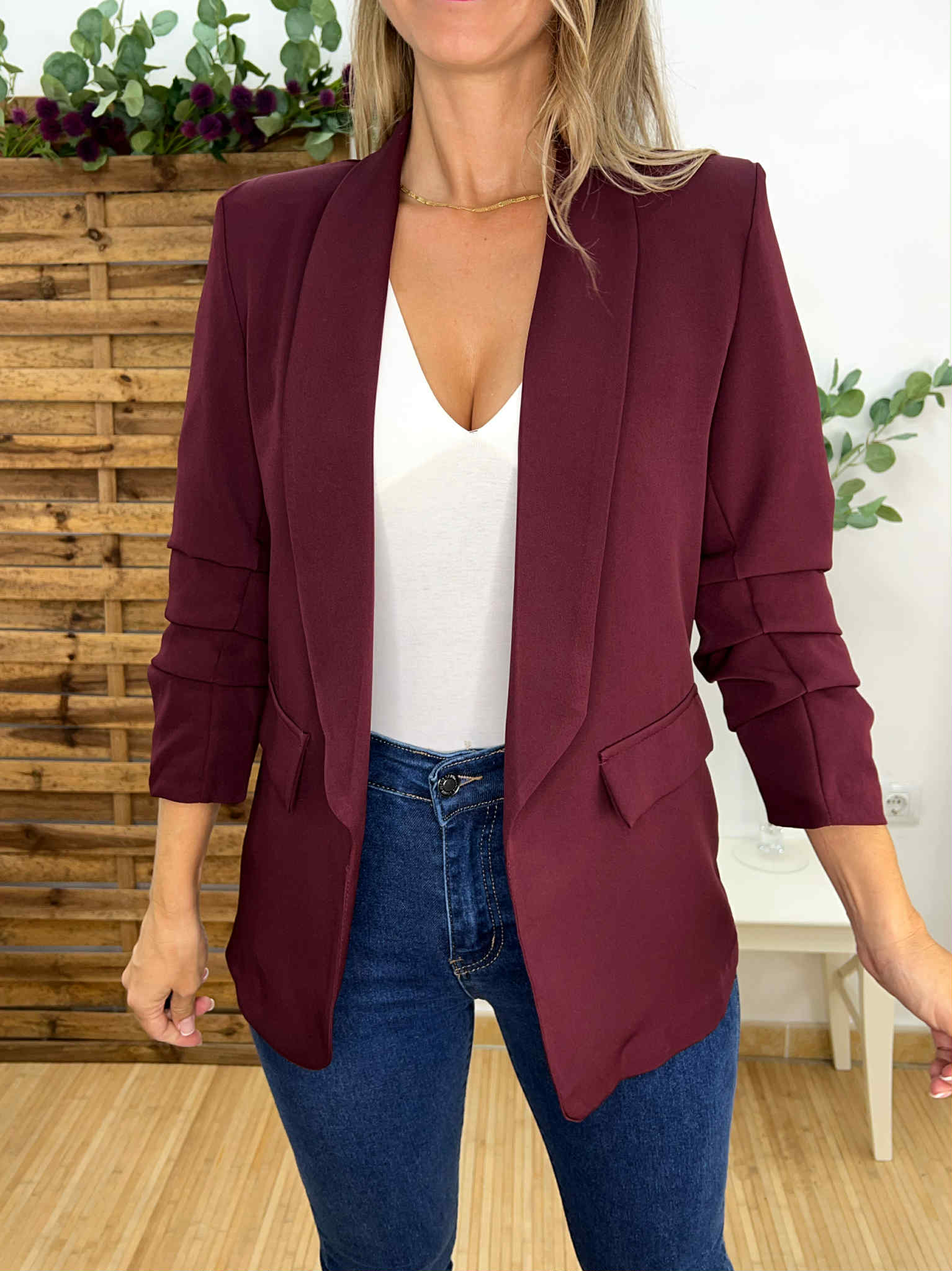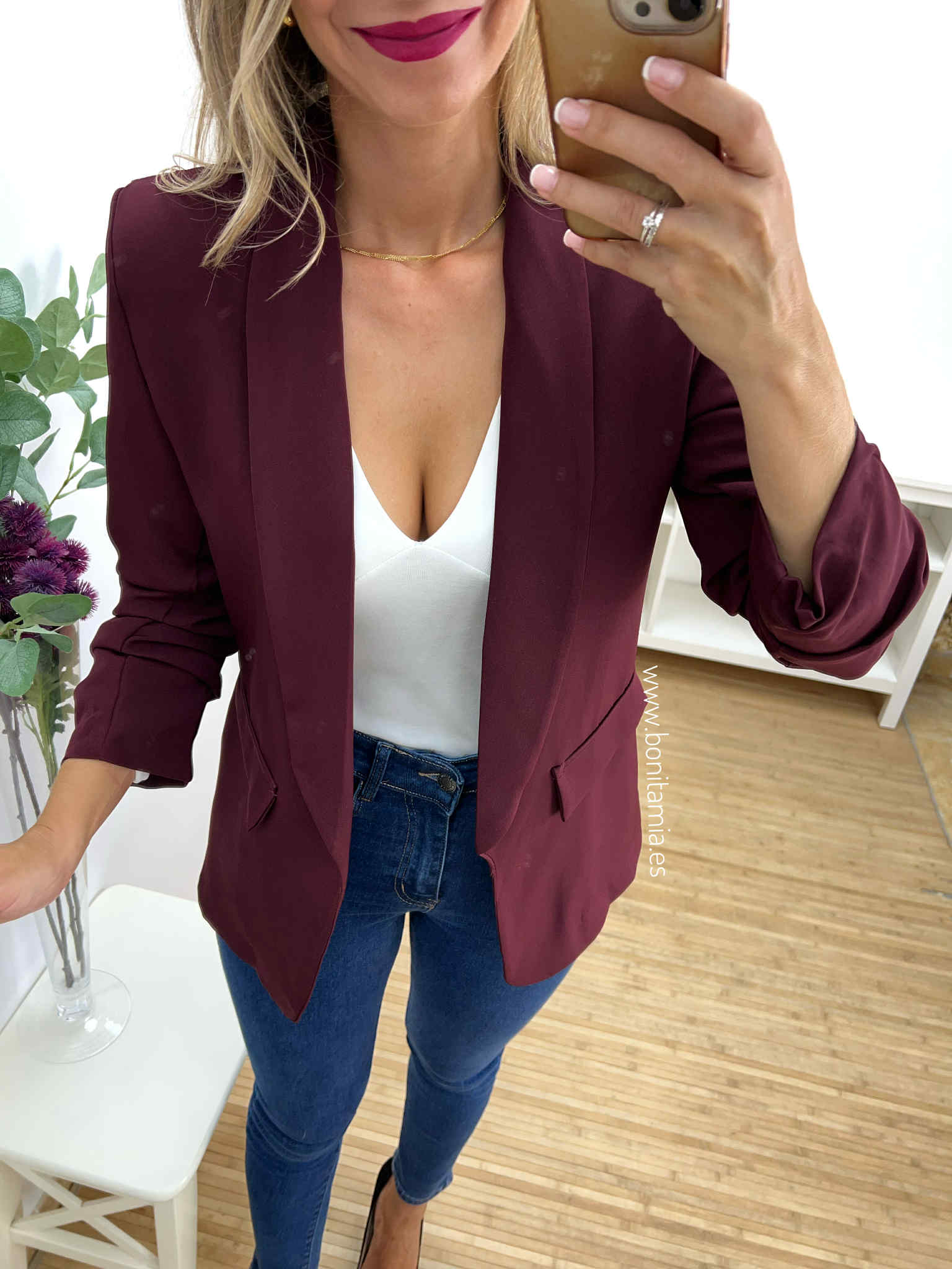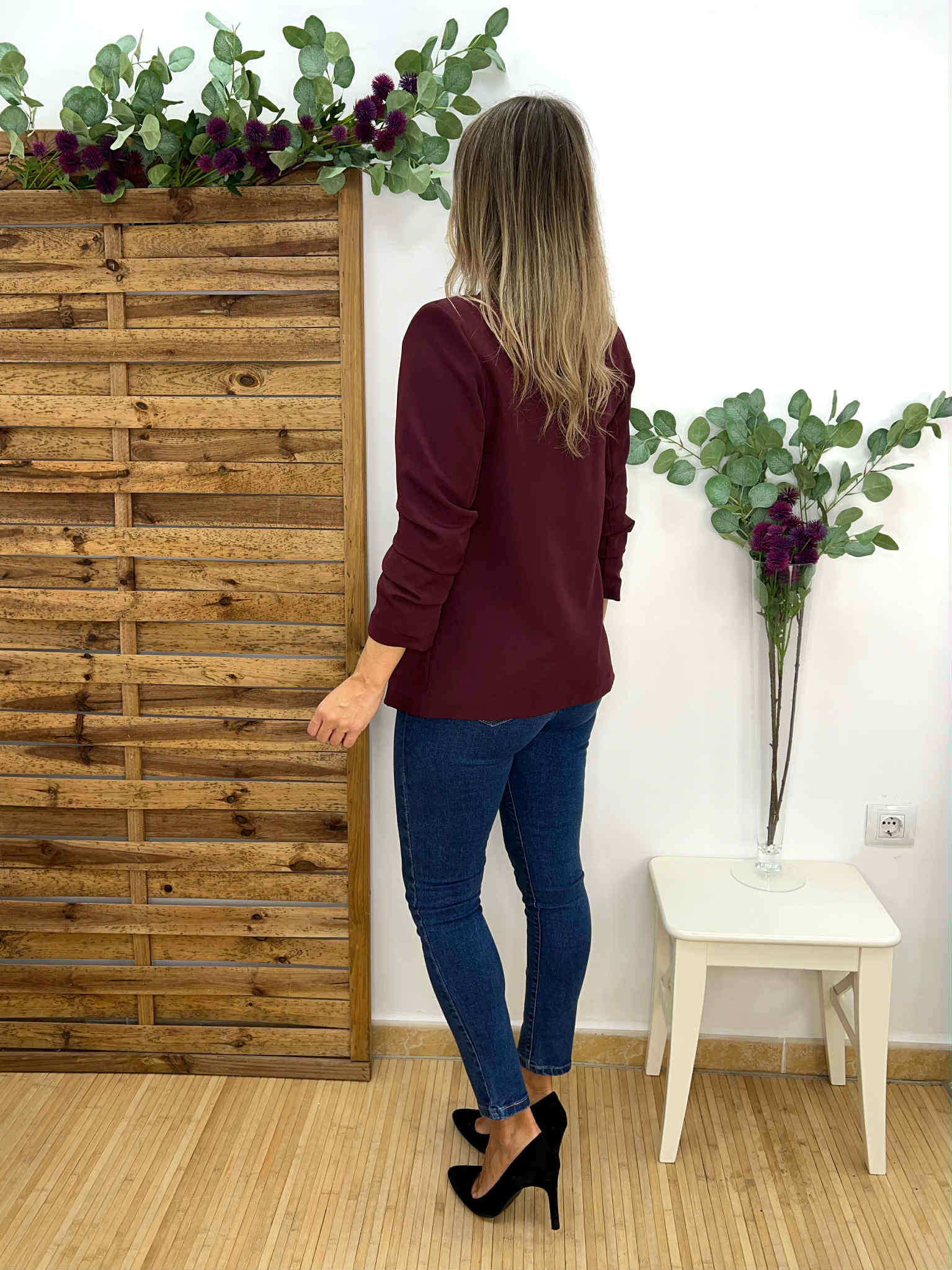 Chaqueta americana burdeos de manga fruncida, solapas en la parte delantera y forro interior.
