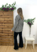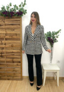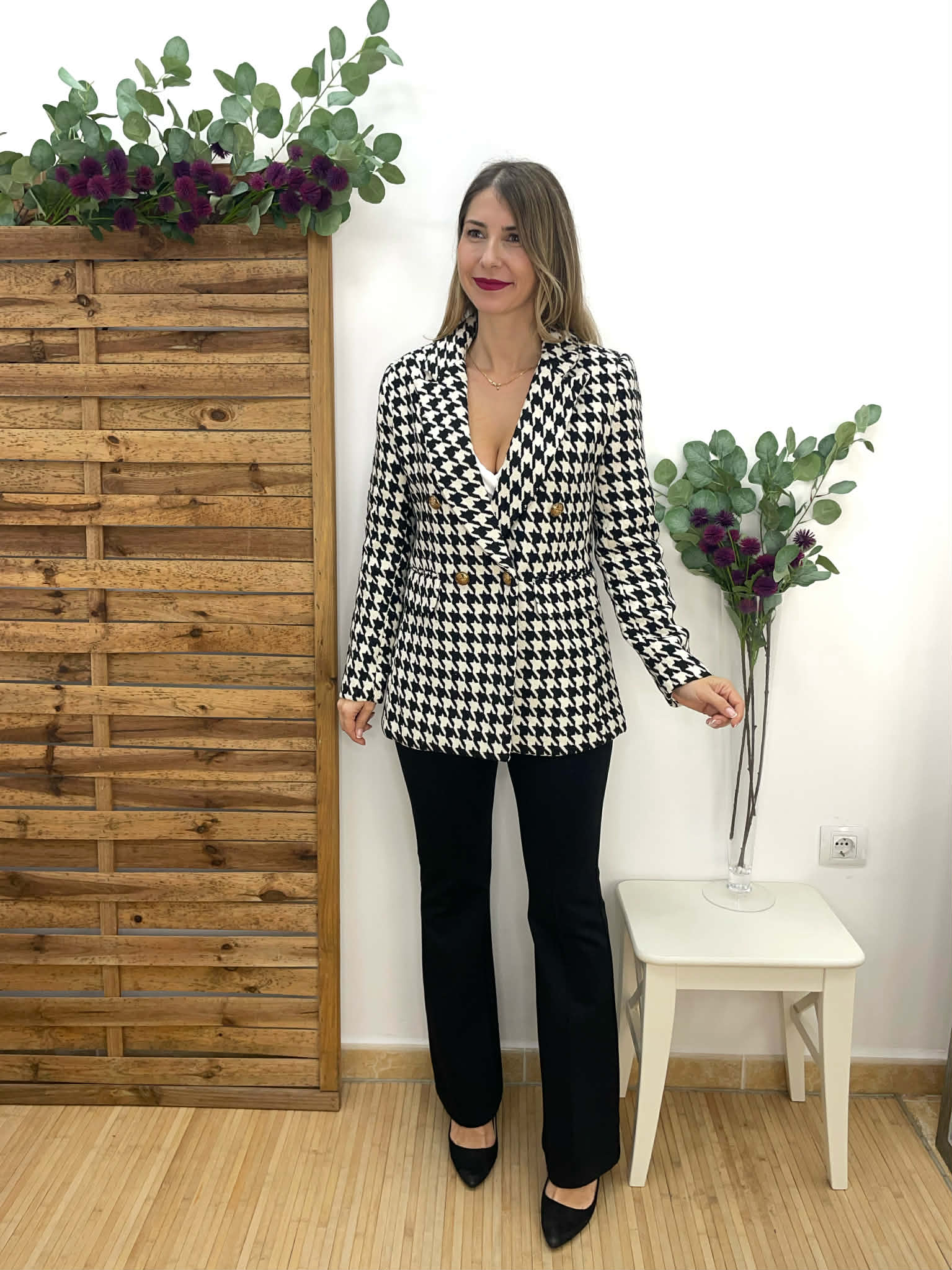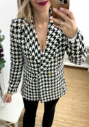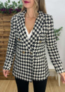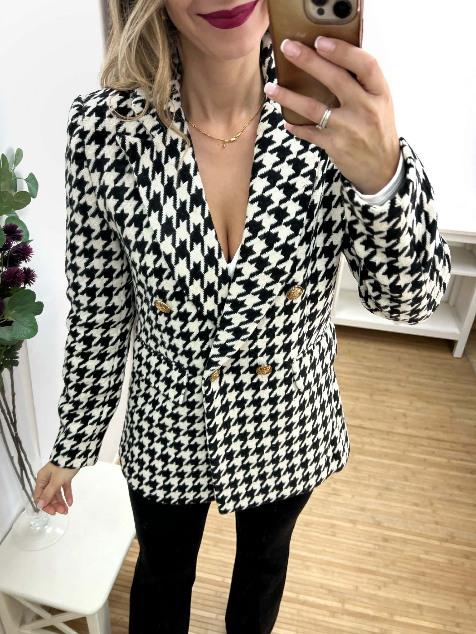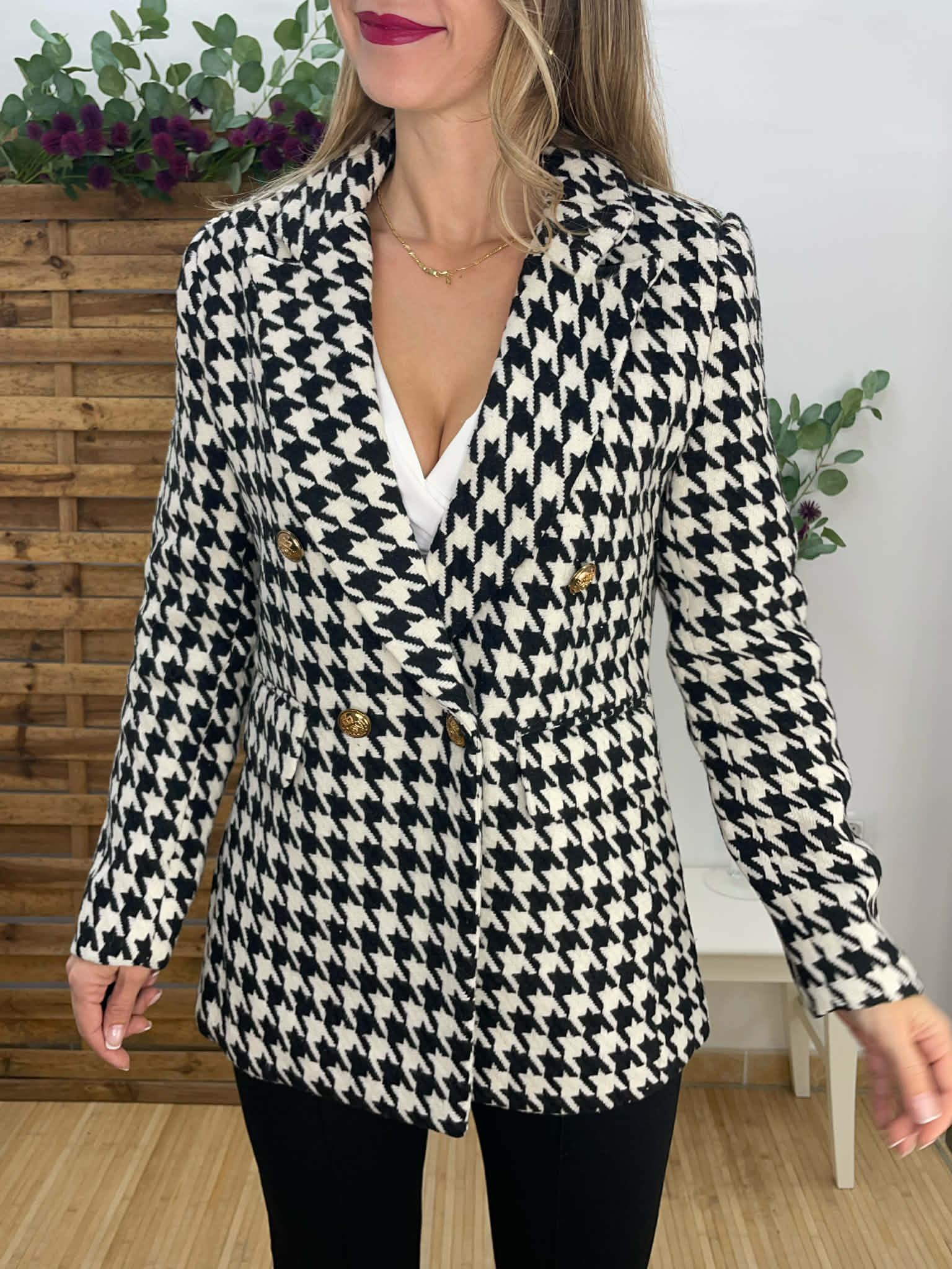 Blazzer de lana con estampado en pata de gallo negro y blanco, solapas en la parte delantera y botones en dorado.
