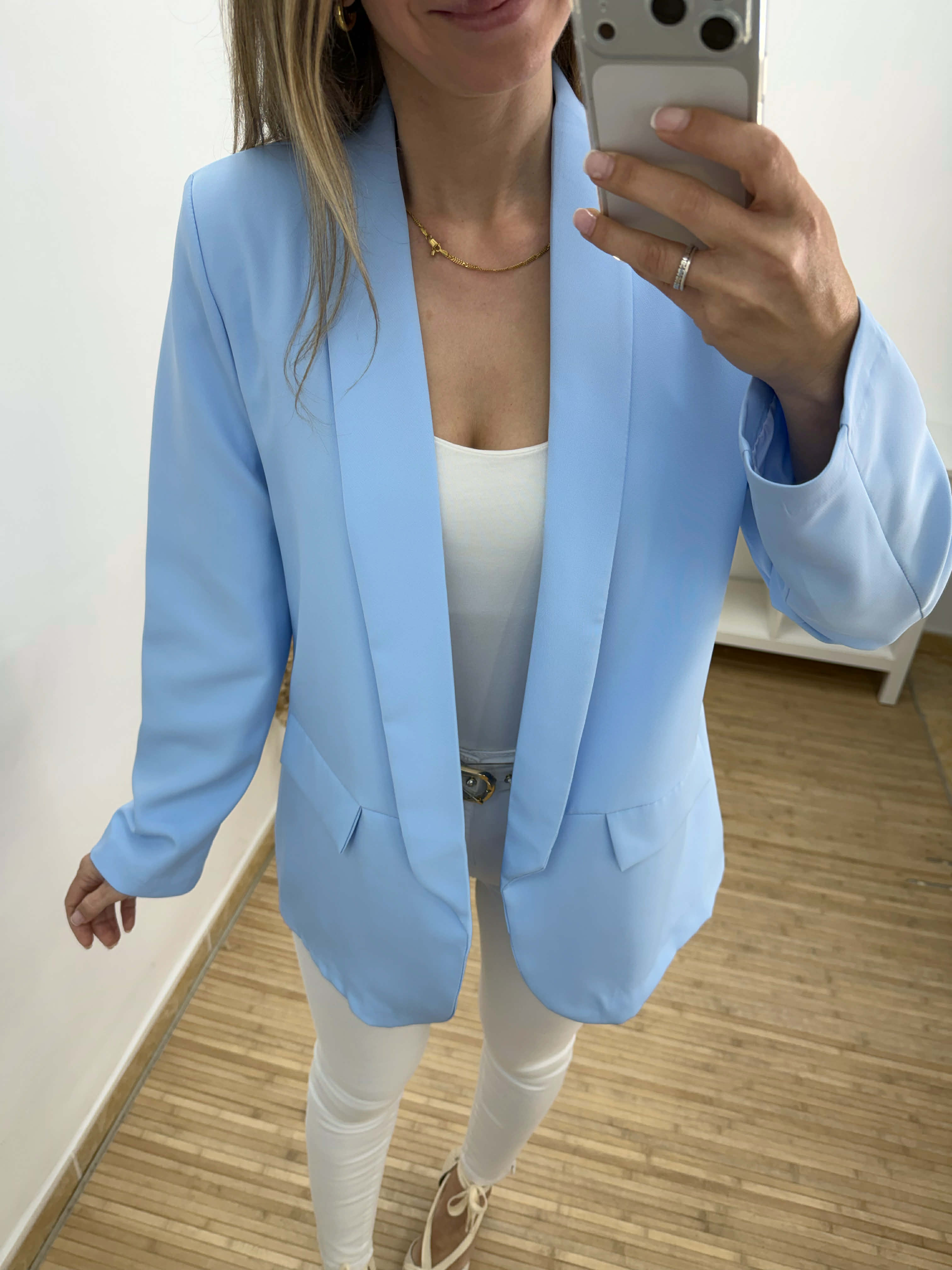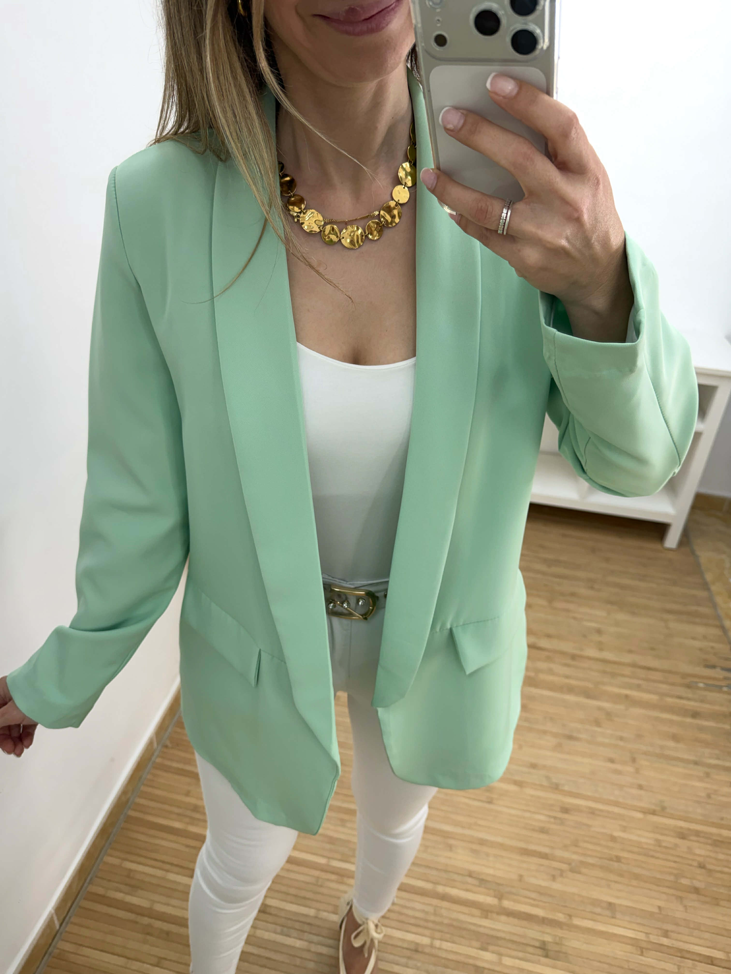 Chaqueta americana con solapas en la parte delantera ,forro interior y pequeñas hombreras. Colores disponibles: menta y celeste.