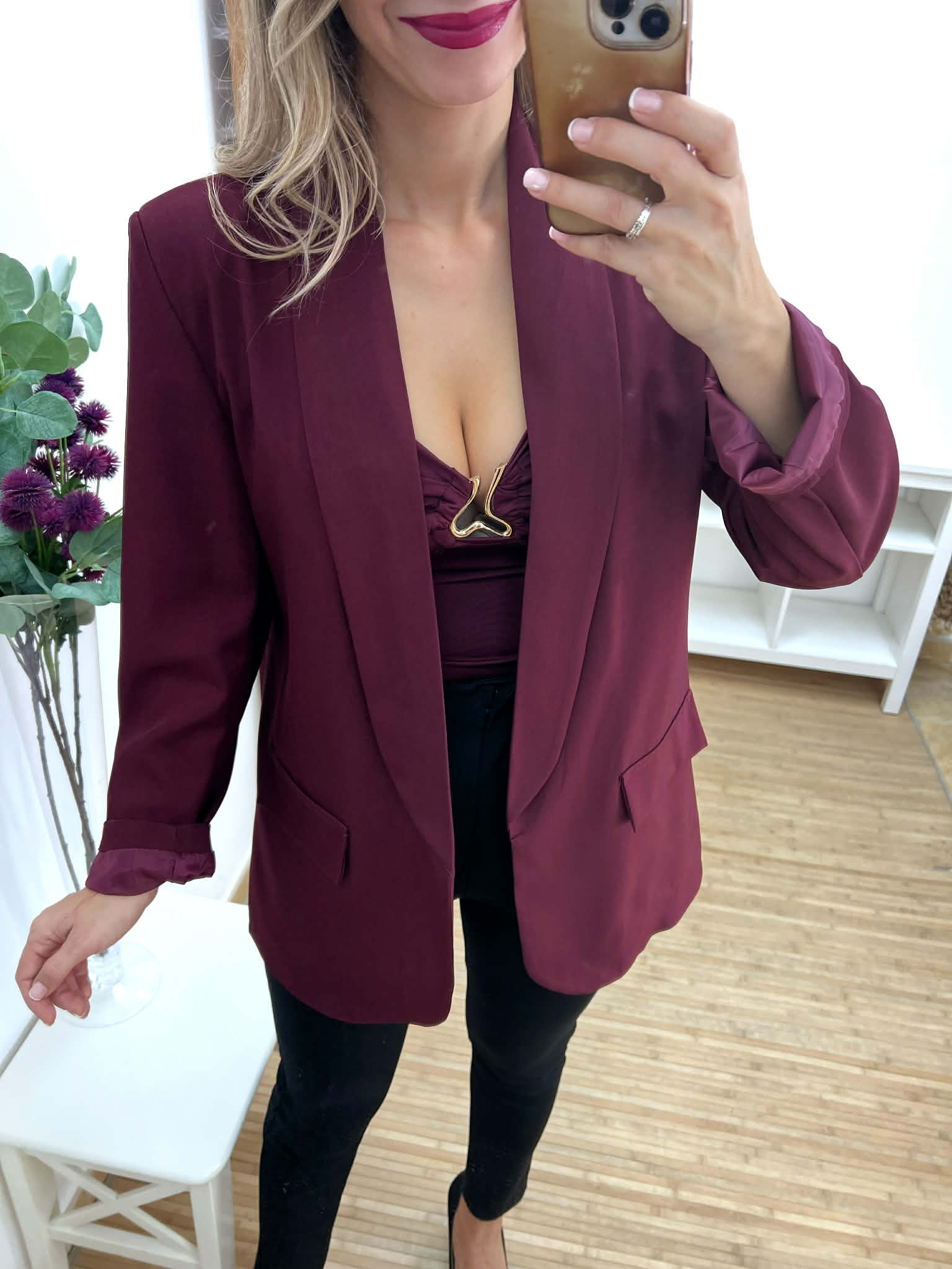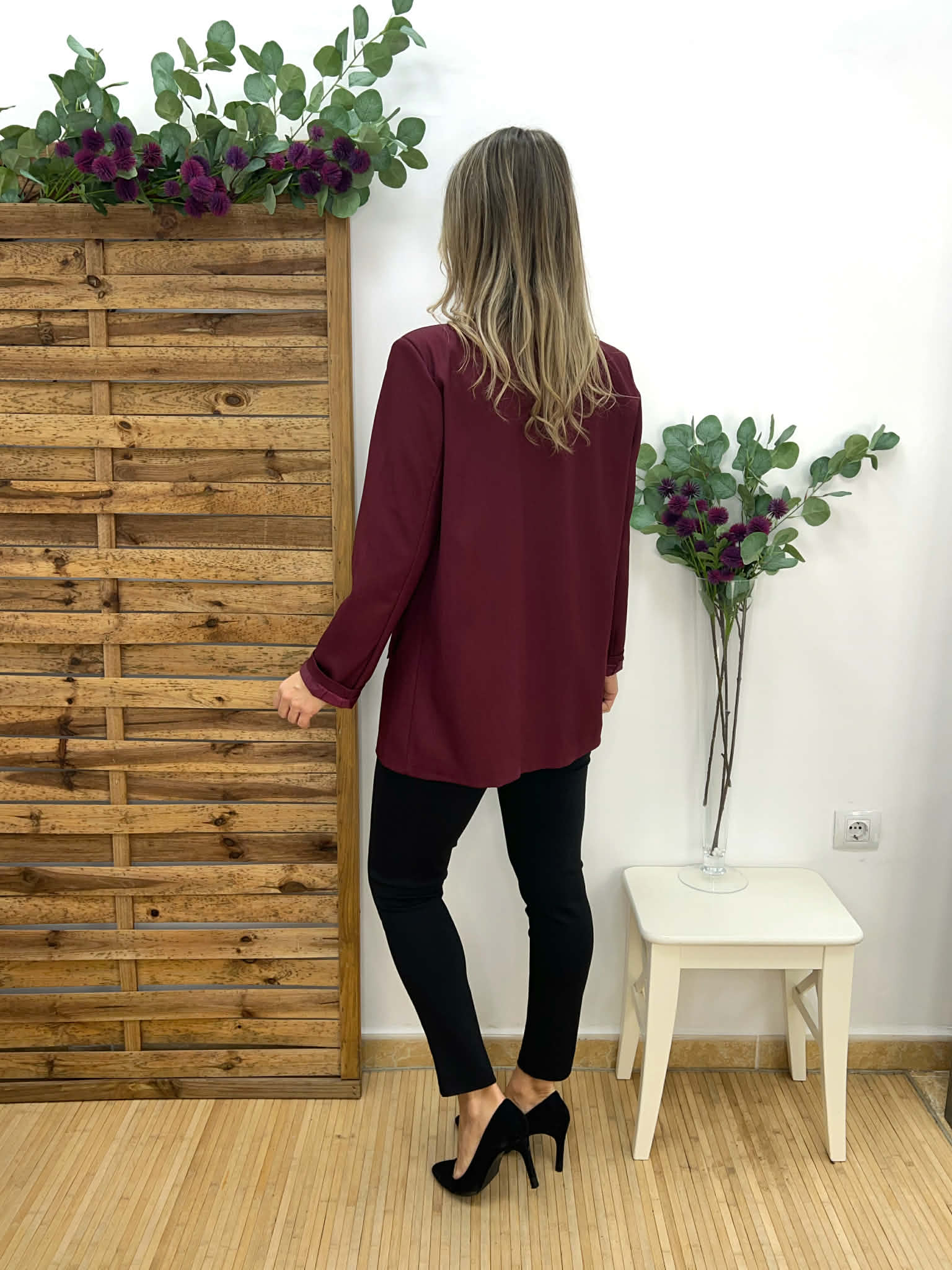Chaqueta americana en color burdeos oversize con solapas en la parte delantera y forro interior.