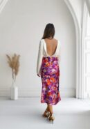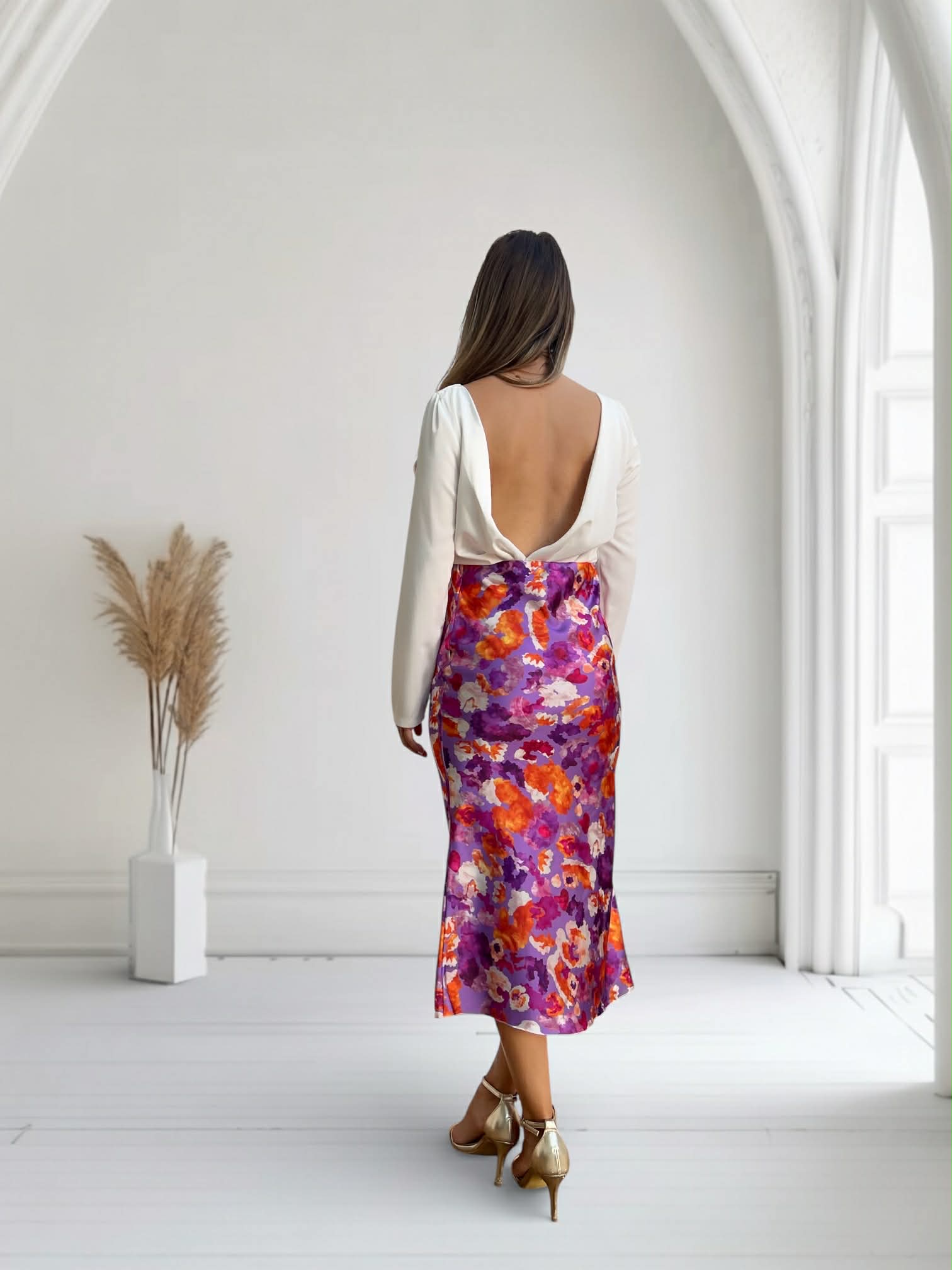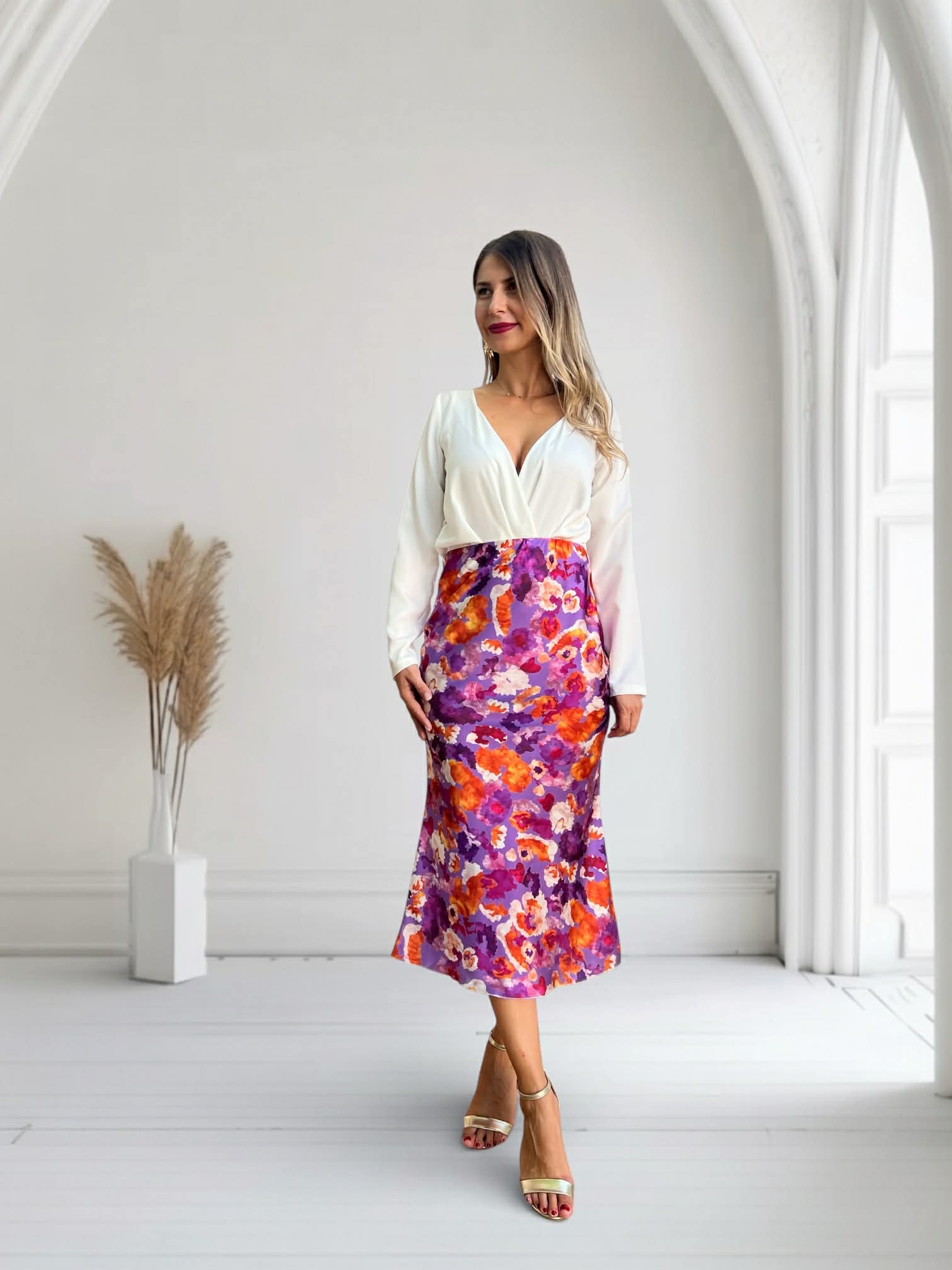 Blusa satinada de manga larga en color blanco con escote en V pronunciado y tres botones dorados. El escote se puede cerrar desplazando los botones o dando un punto.