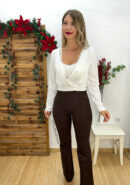 Blusa satinada de manga larga en color blanco con escote en V pronunciado y tres botones dorados. El escote se puede cerrar desplazando los botones o dando un punto.