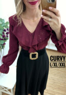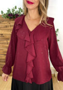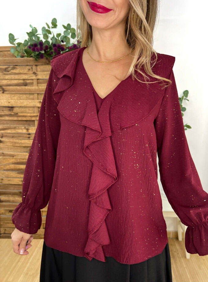 Blusa fluida burdeos con brillo dorado y volantillos. Lleva goma en los puños.