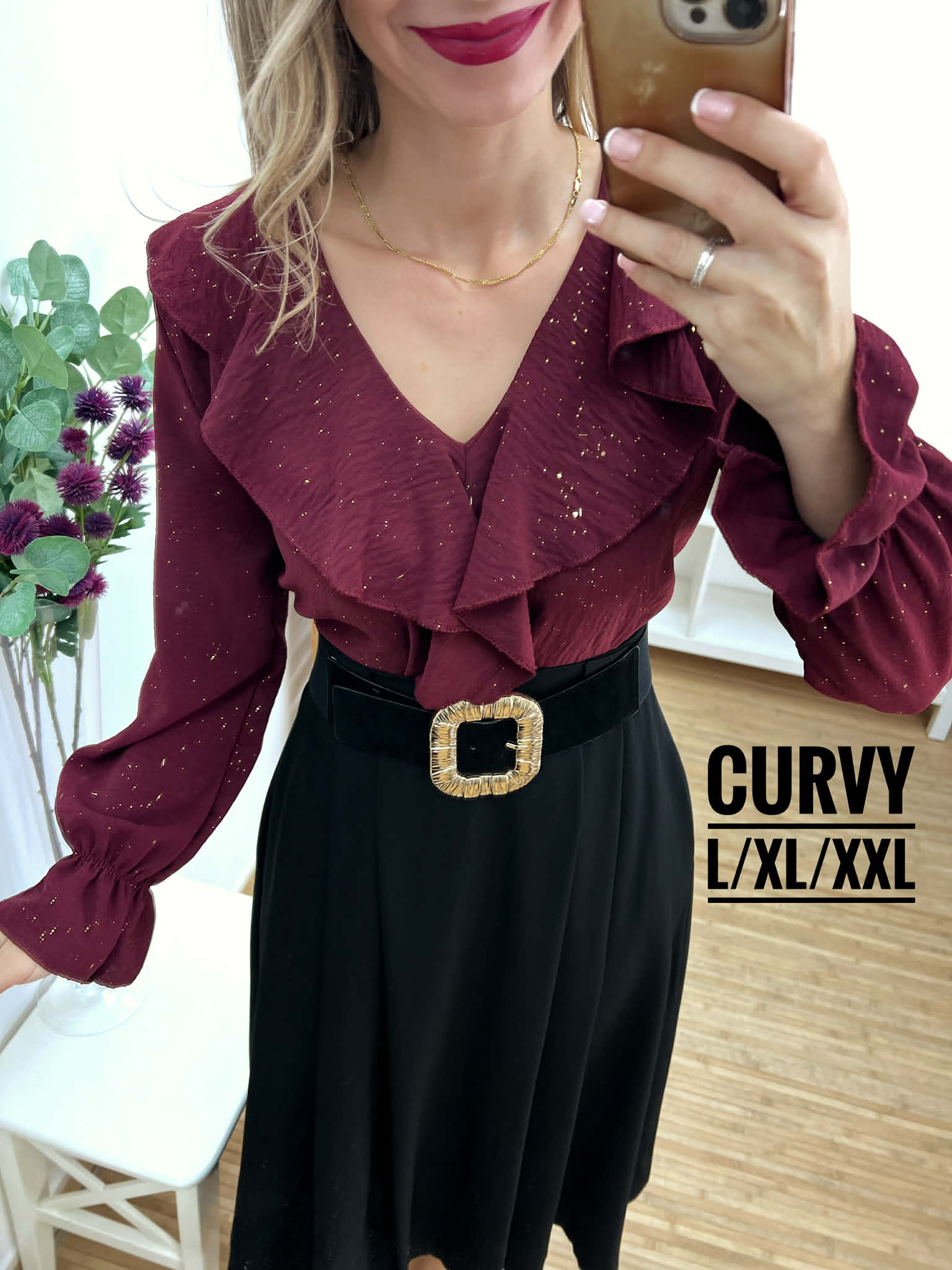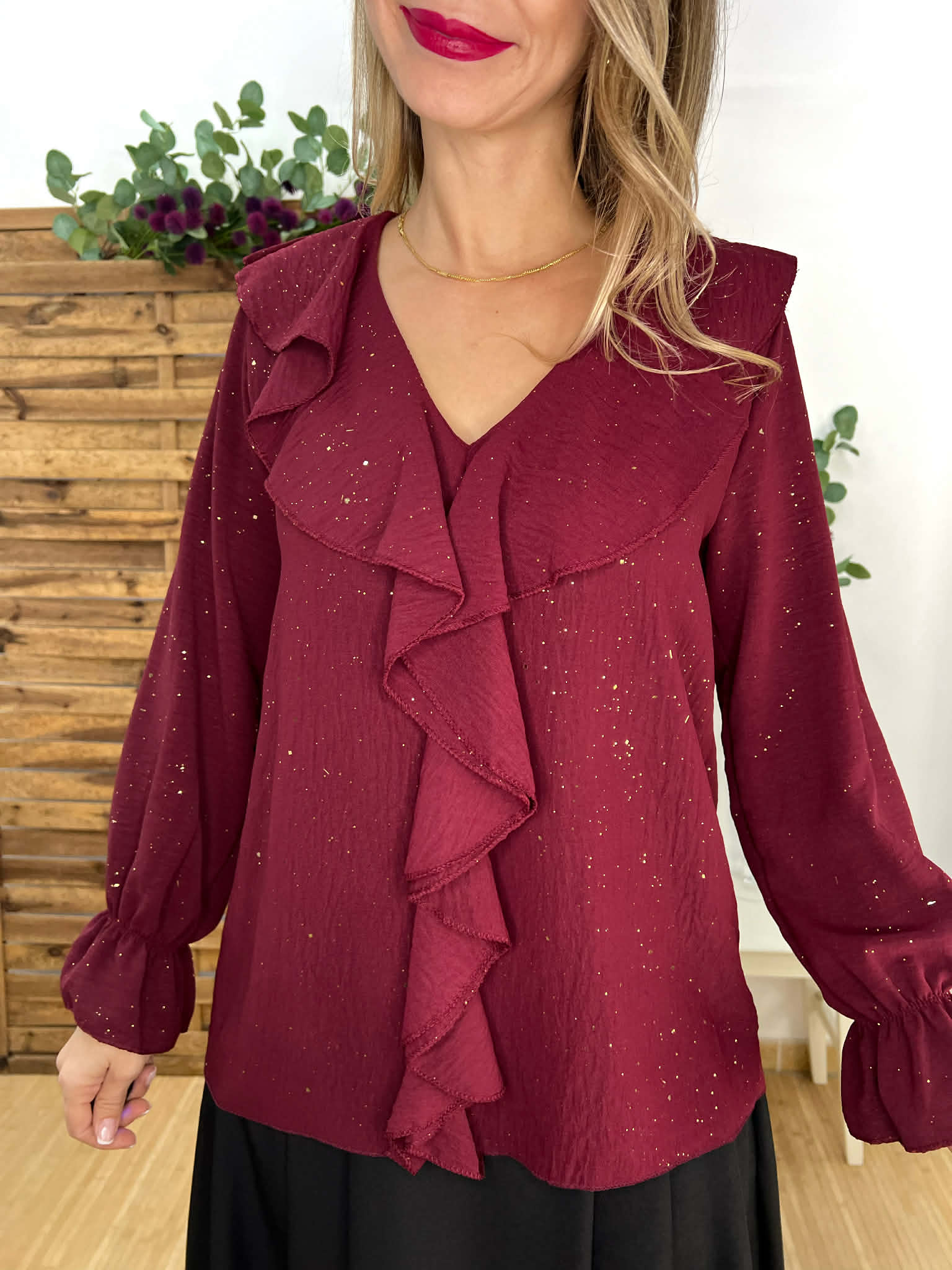 Blusa fluida burdeos con brillo dorado y volantillos. Lleva goma en los puños.
