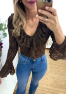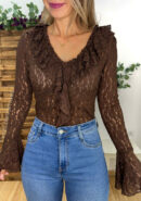 Blusa de encaje marrón chocolate de manga larga con volantillo.