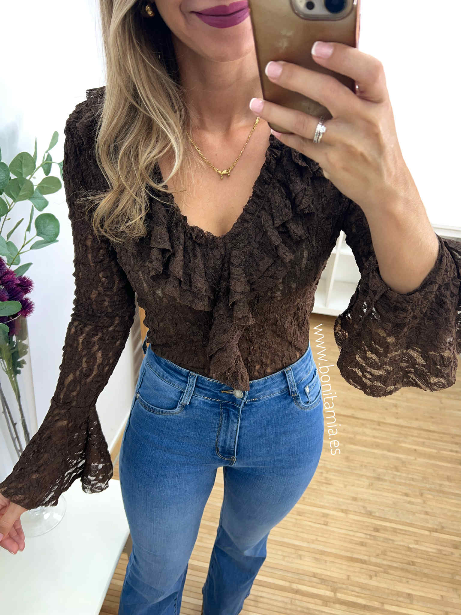Blusa de encaje marrón chocolate de manga larga con volantillo.