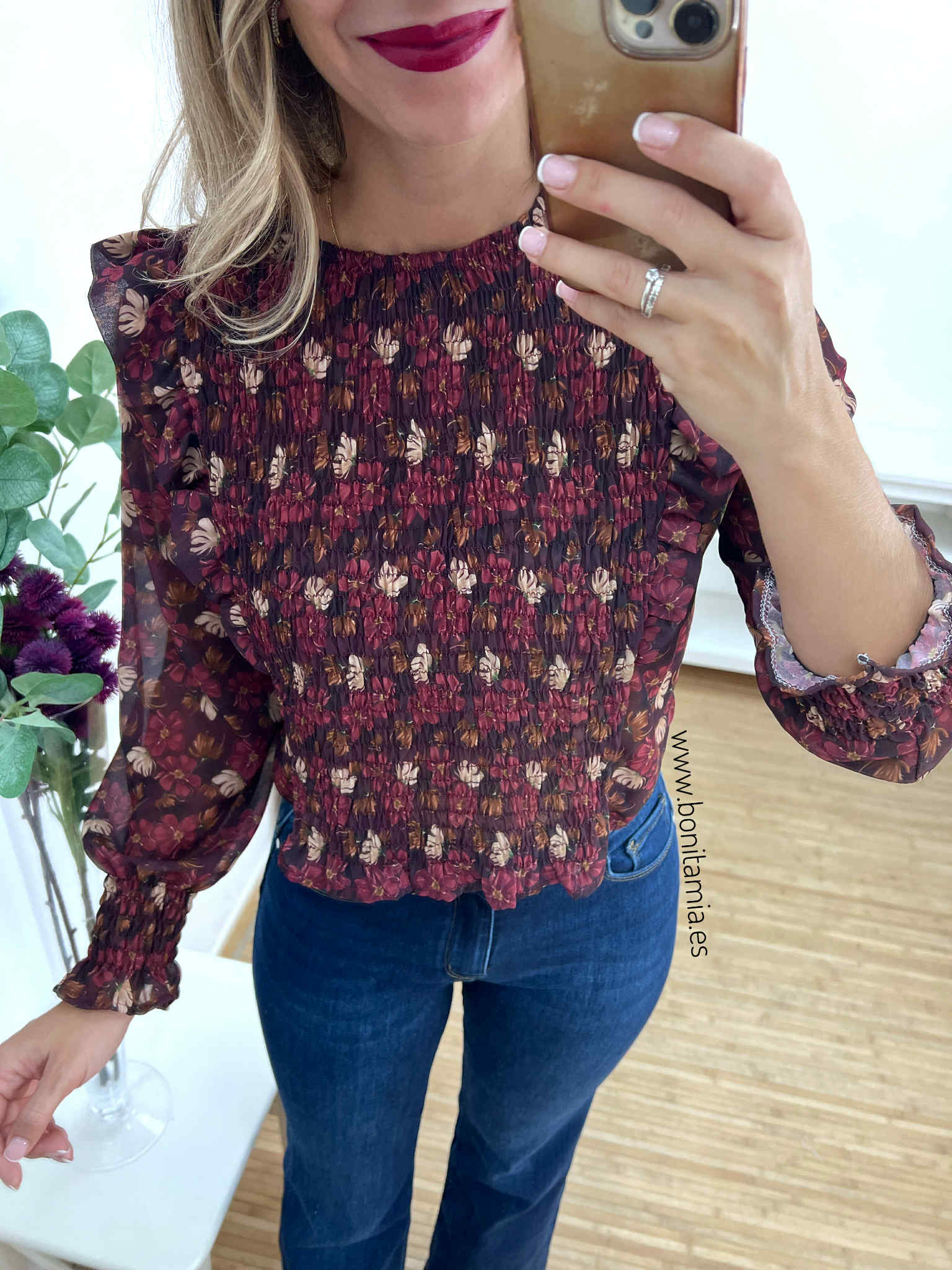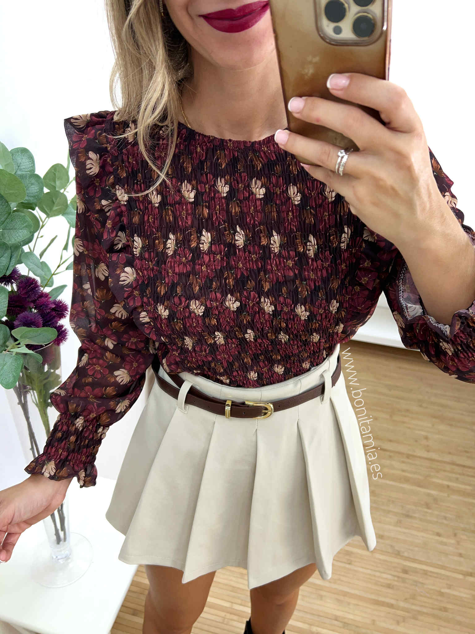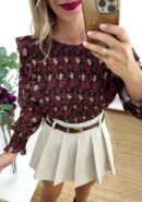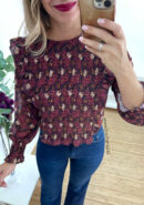 Blusa de gasa floral en tonos burdeos, beige y camel con nido de abeja y volantillos. Lleva botón atrás.