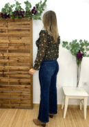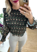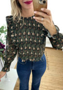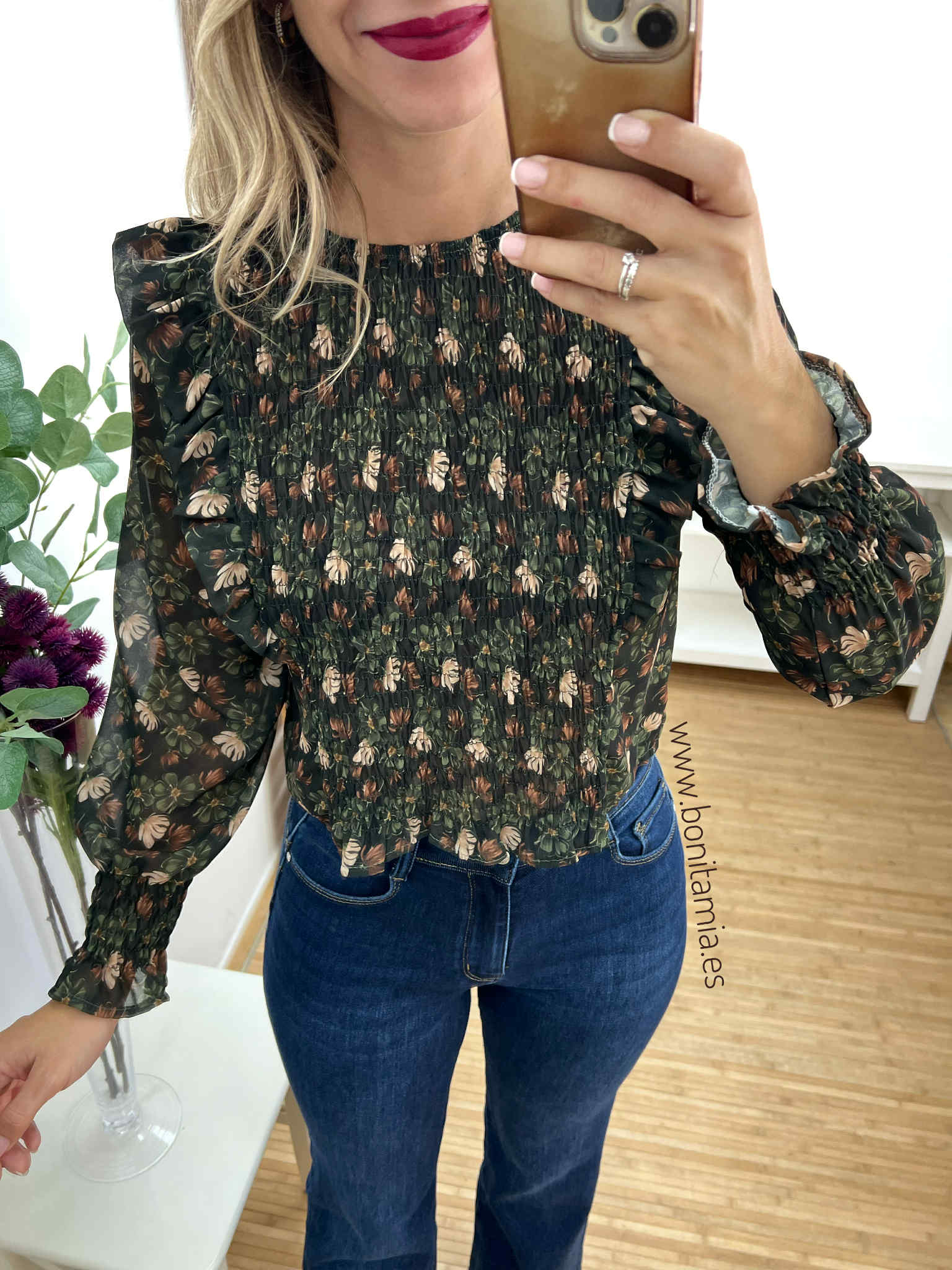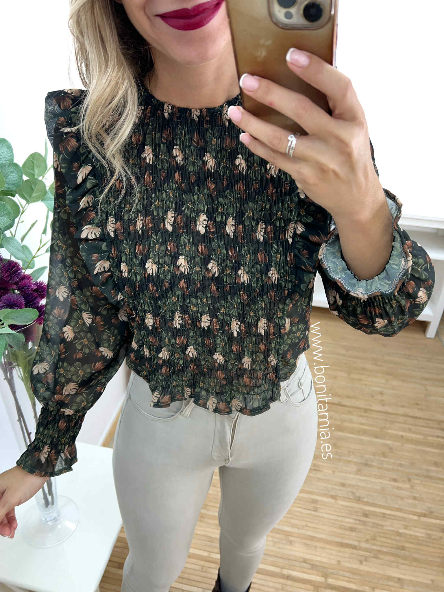 Blusa de gasa floral en tonos verde, beige y camel con nido de abeja y volantillos. Lleva botón atrás.