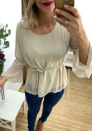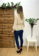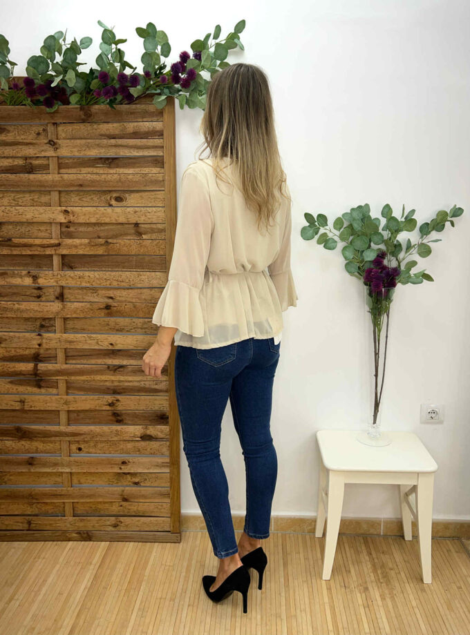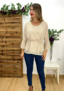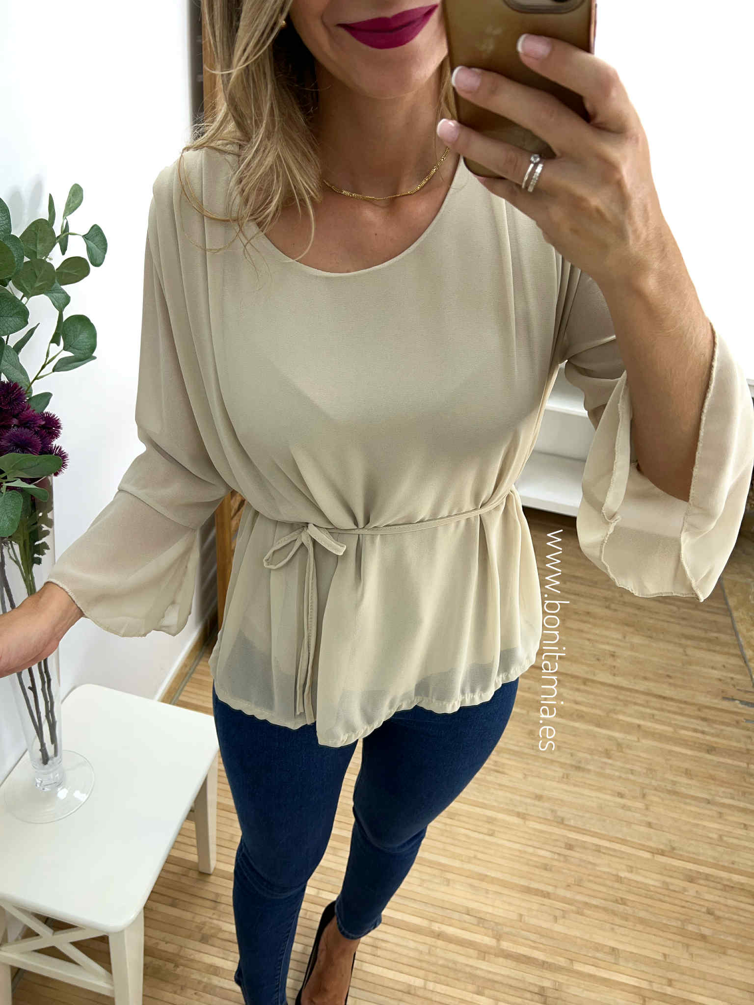 Blusa de gasa en color beige de manga larga con forro interior y lazada para ajustar.