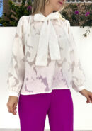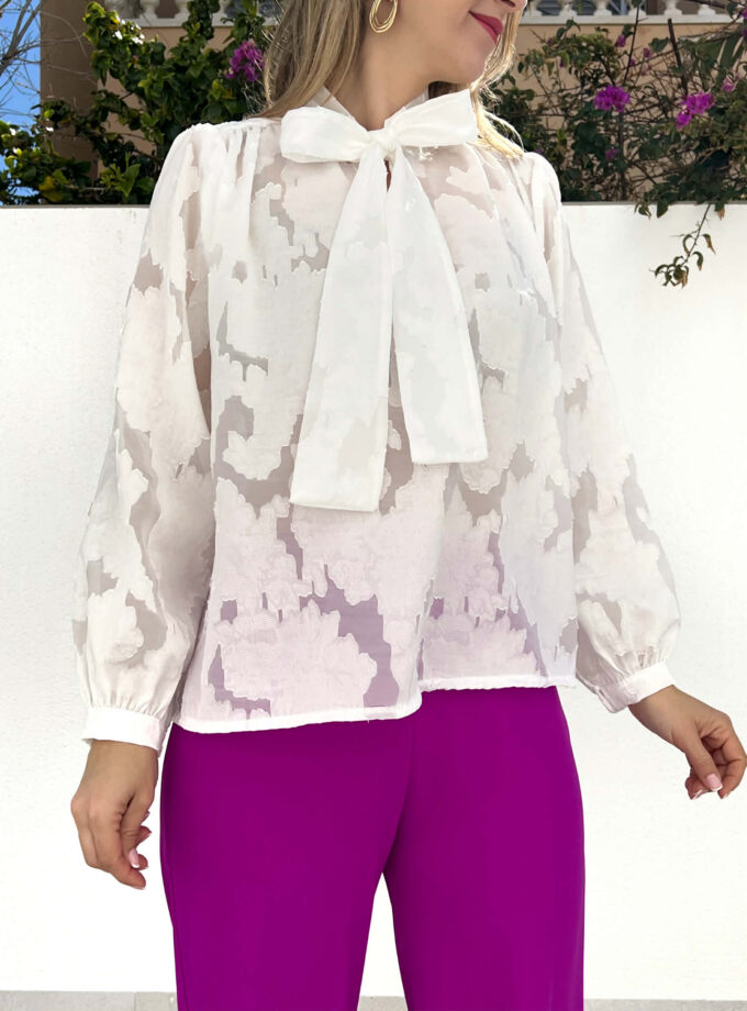 Blusa blanca de manga larga de gasa con detalle de lazo en el cuello.