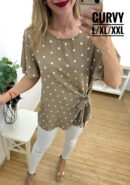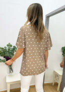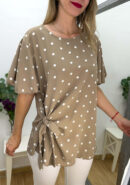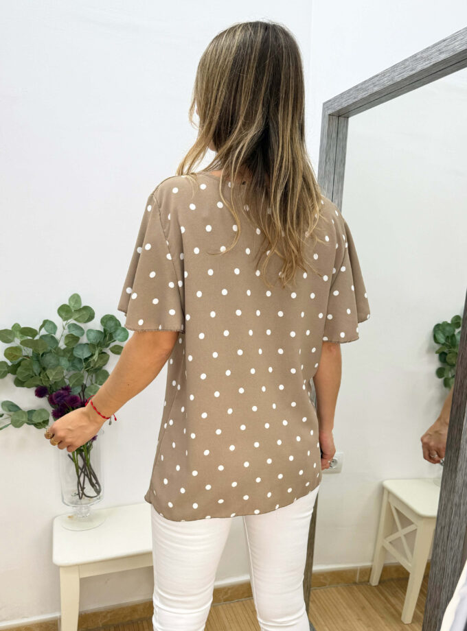 Blusa fluida camel con lunares blancos, manga corta y detalle de lazada en el lateral derecho.