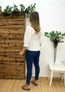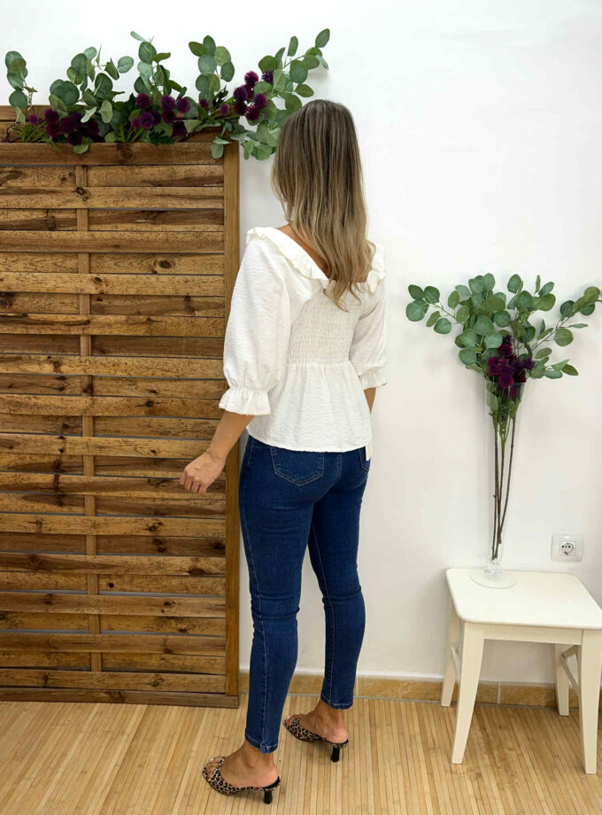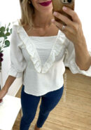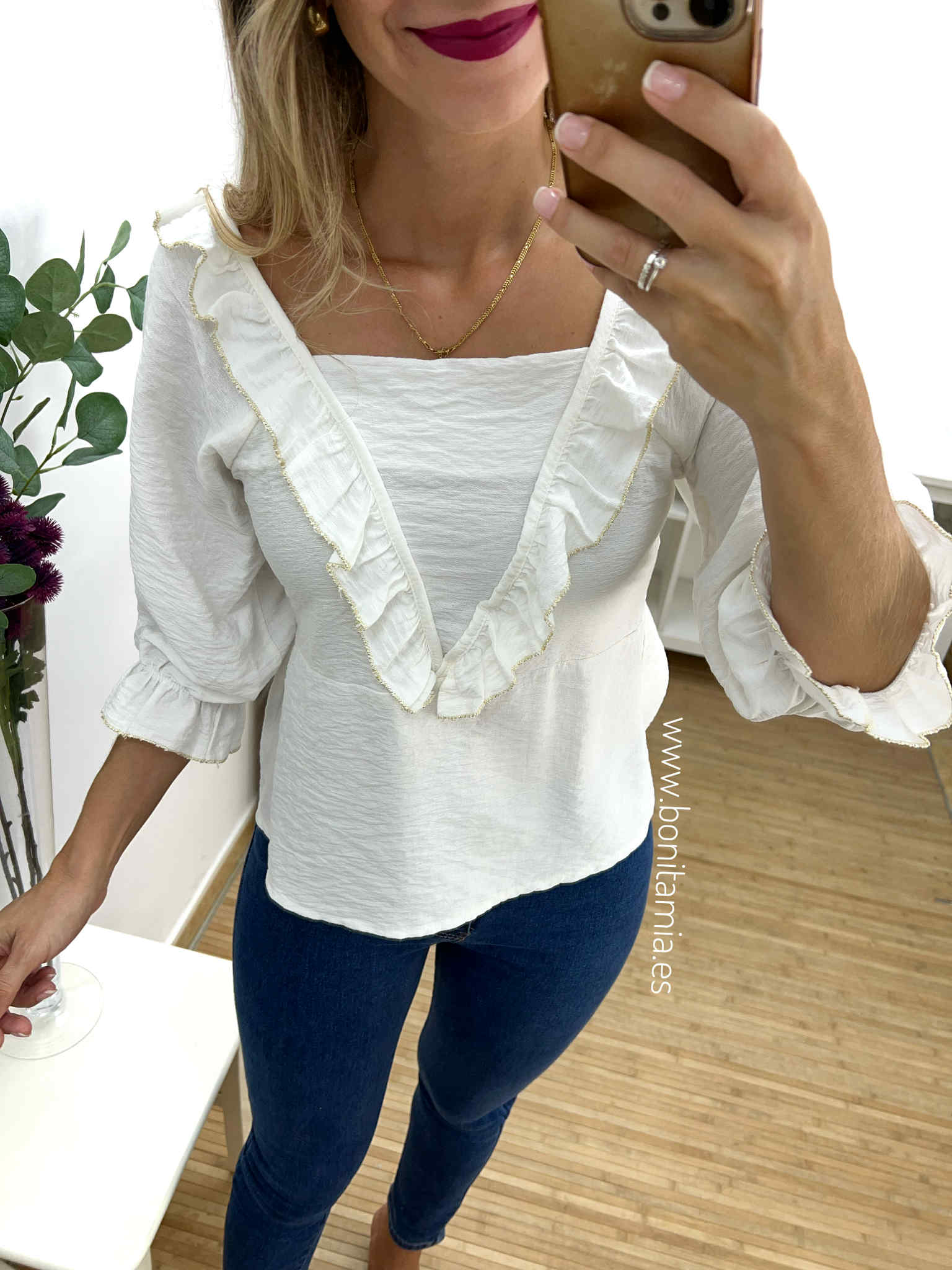 Blusa fluida en color blanco con manga al codo, volante en la parte delantera con detalle hilo dorado, goma en los puños y nido de abeja en la parte de la espalda.