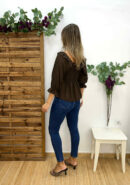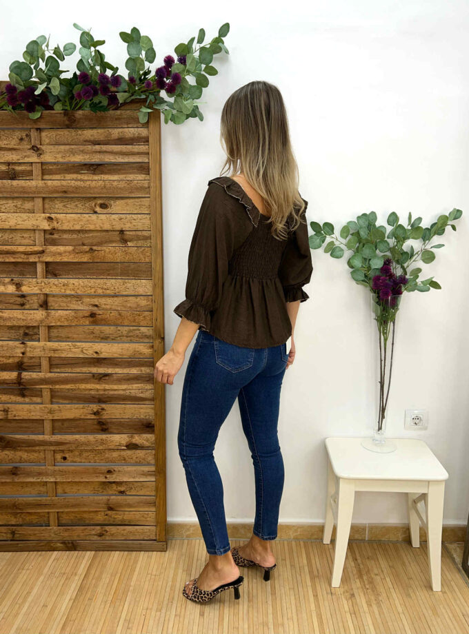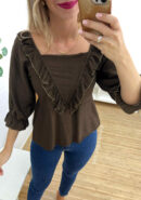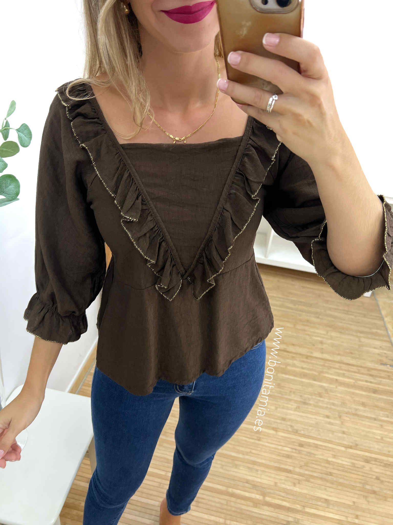 Blusa fluida en color marrón chocolate con manga al codo, volante en la parte delantera con detalle hilo dorado, goma en los puños y nido de abeja en la parte de la espalda.