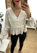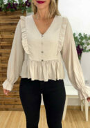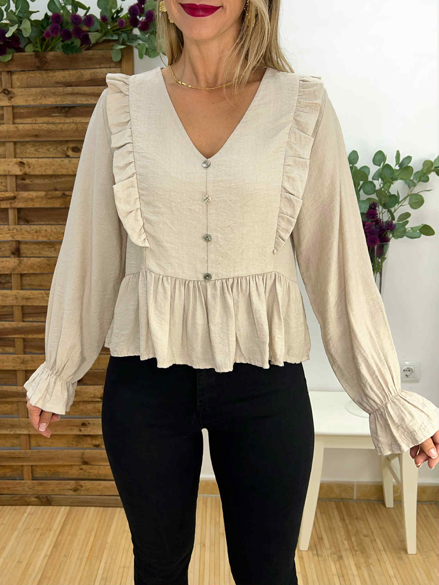 Blusa fluida beige con detalle de volantillos y volante bajo. Lleva goma en los puños.