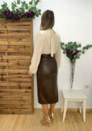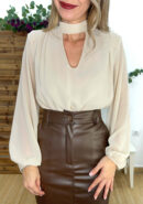 Body beige de gasa con cuello halter y espalda semi abierta. Lleva hombreras.