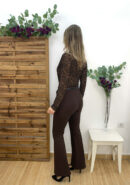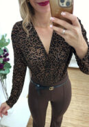 Body de tul marrón chocolate con estampado de leopardo negro terciopelo y escote cruzado.