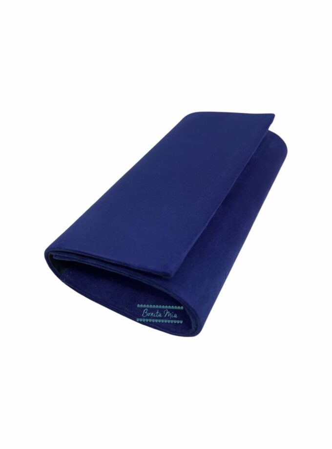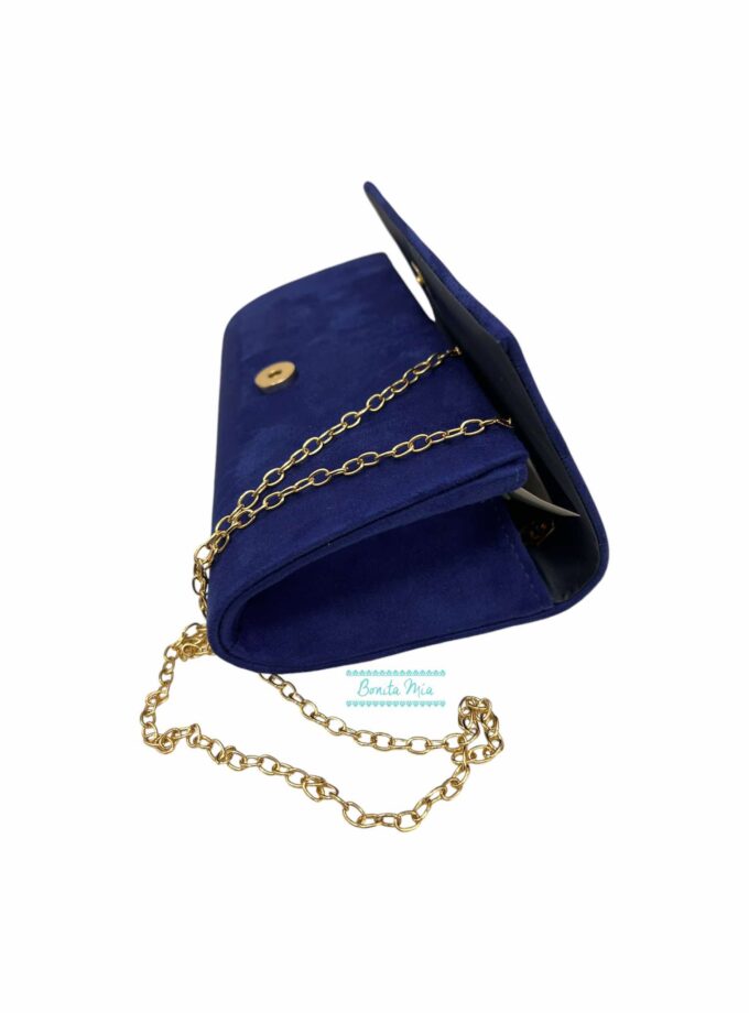 Bolso de fiesta en tono azul. Incluye cadena para colgar en dorada. Tejido tacto melocotón.