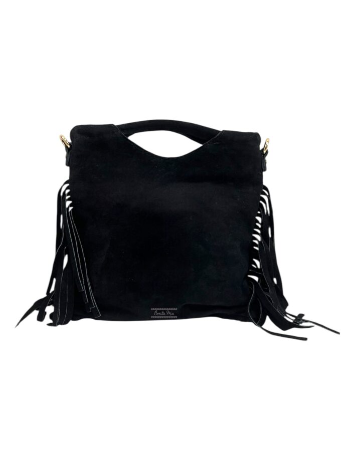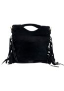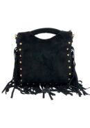 Bolso negro de piel cuadrado con flecos y tachuelas doradas en la parte delantera. Cierre de cremallera interior y cadena de mismo color y piel para colgar.