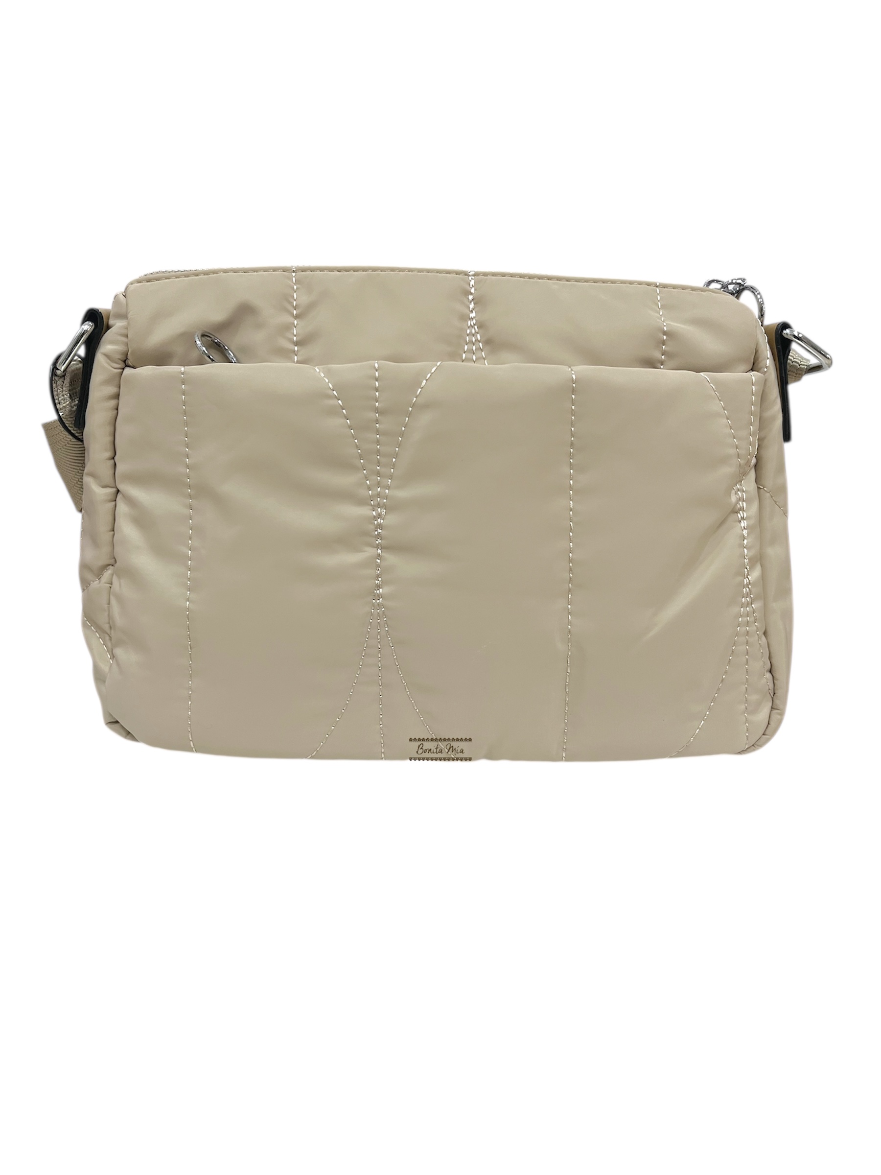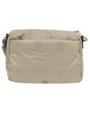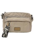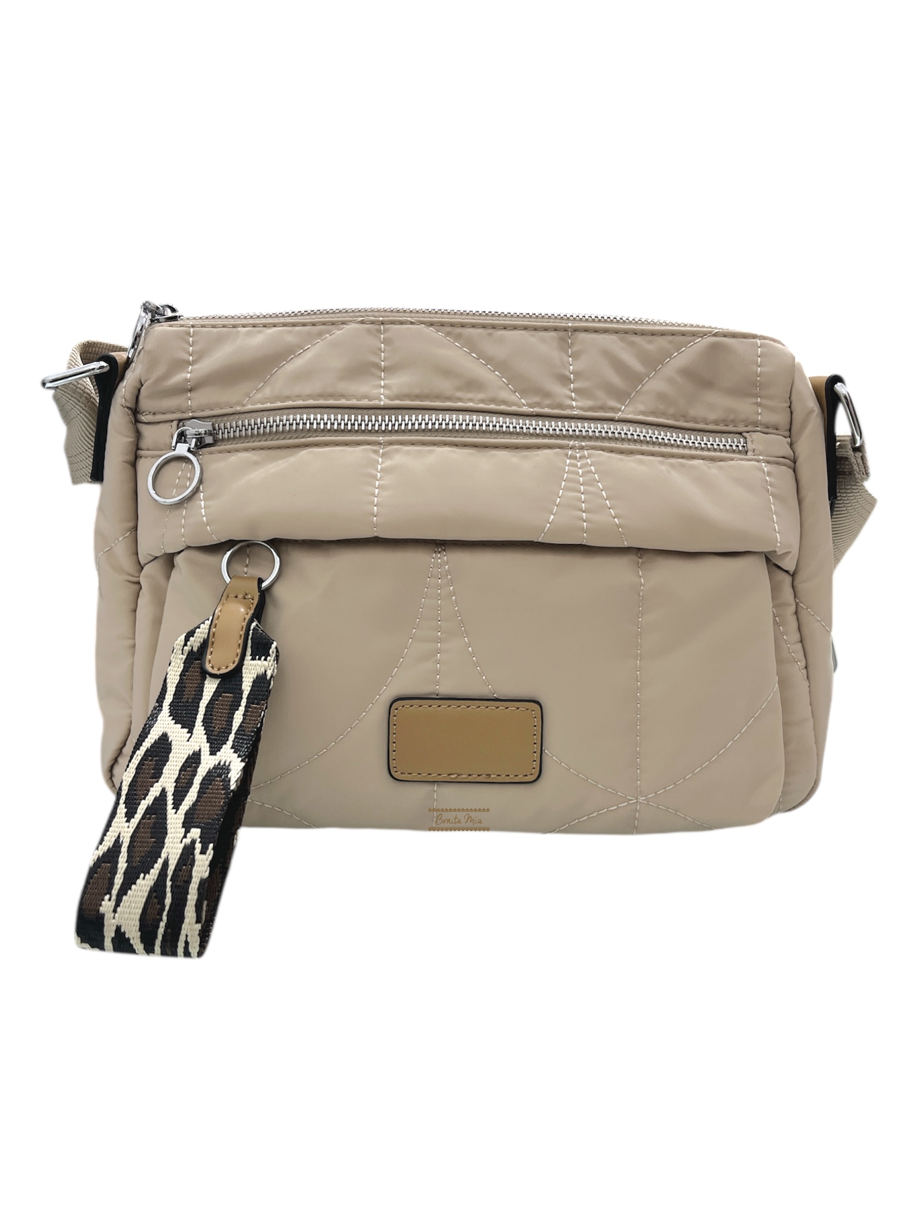 Bolso de nylon tipo bandolera beige con cremallera y bolsillos. Incluye asa para colgar y colgante decorativo en estampado leopardo.