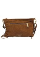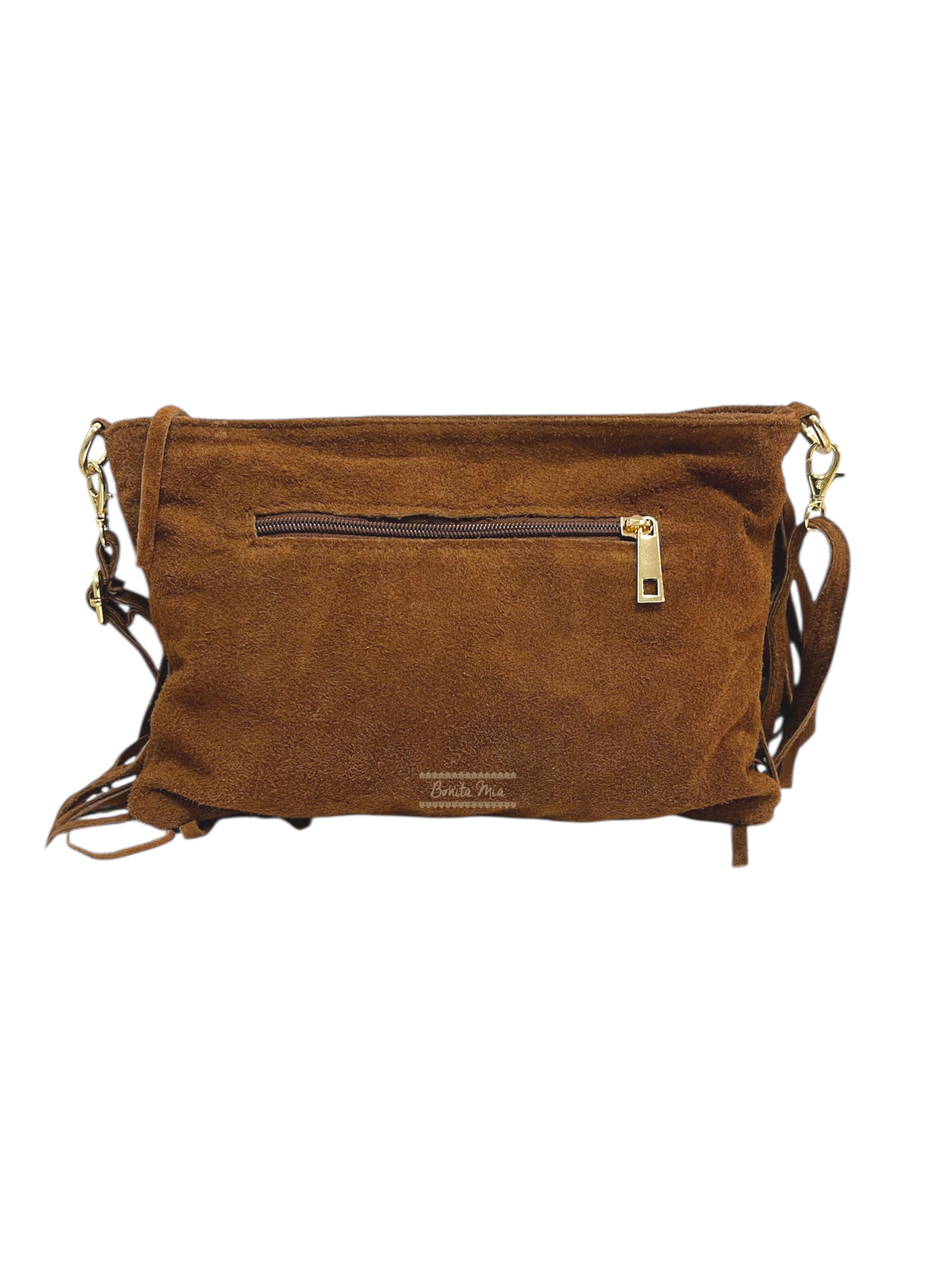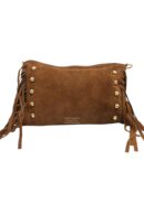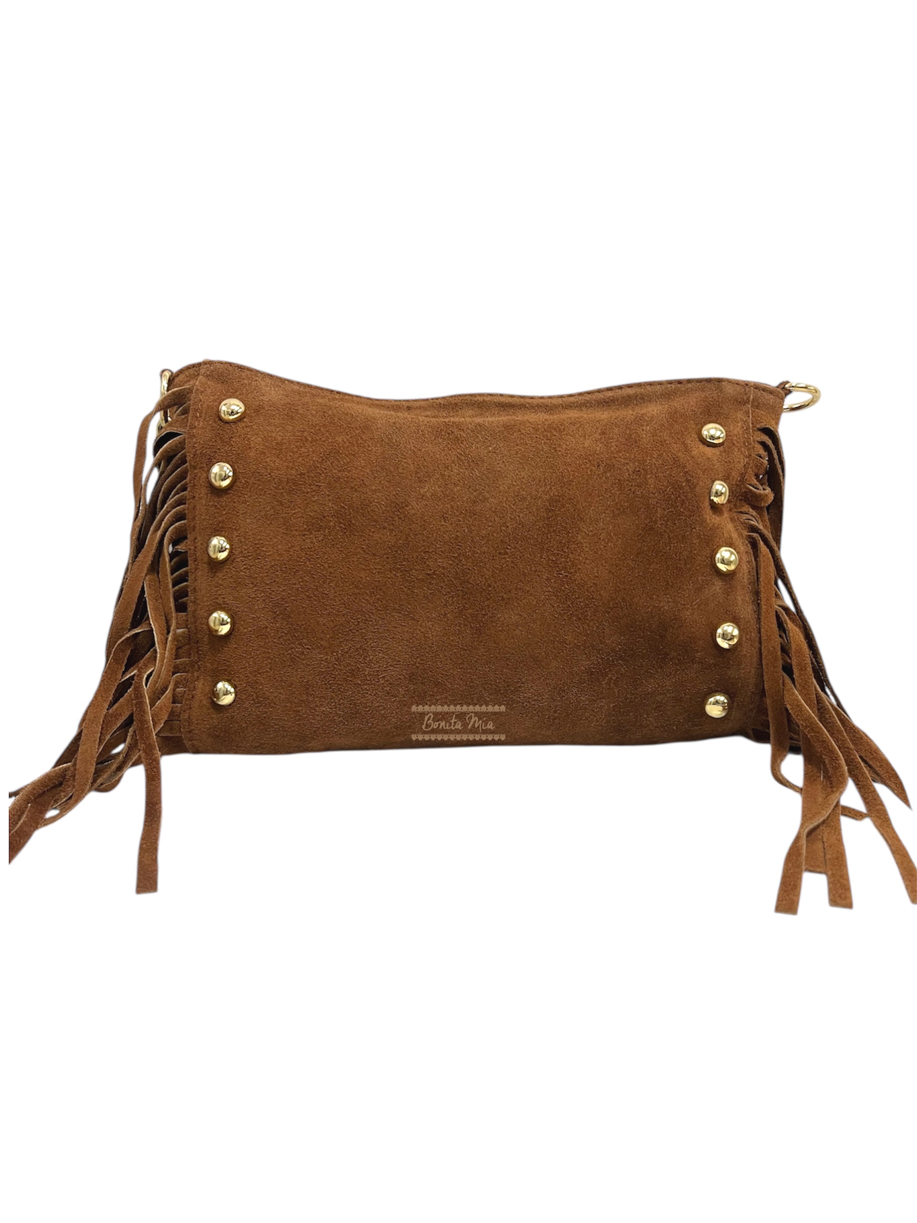 Bolso camel de piel rectangular con flecos y tachuelas doradas en la parte delantera. Cierre de cremallera interior y cadena de mismo color y piel para colgar.