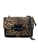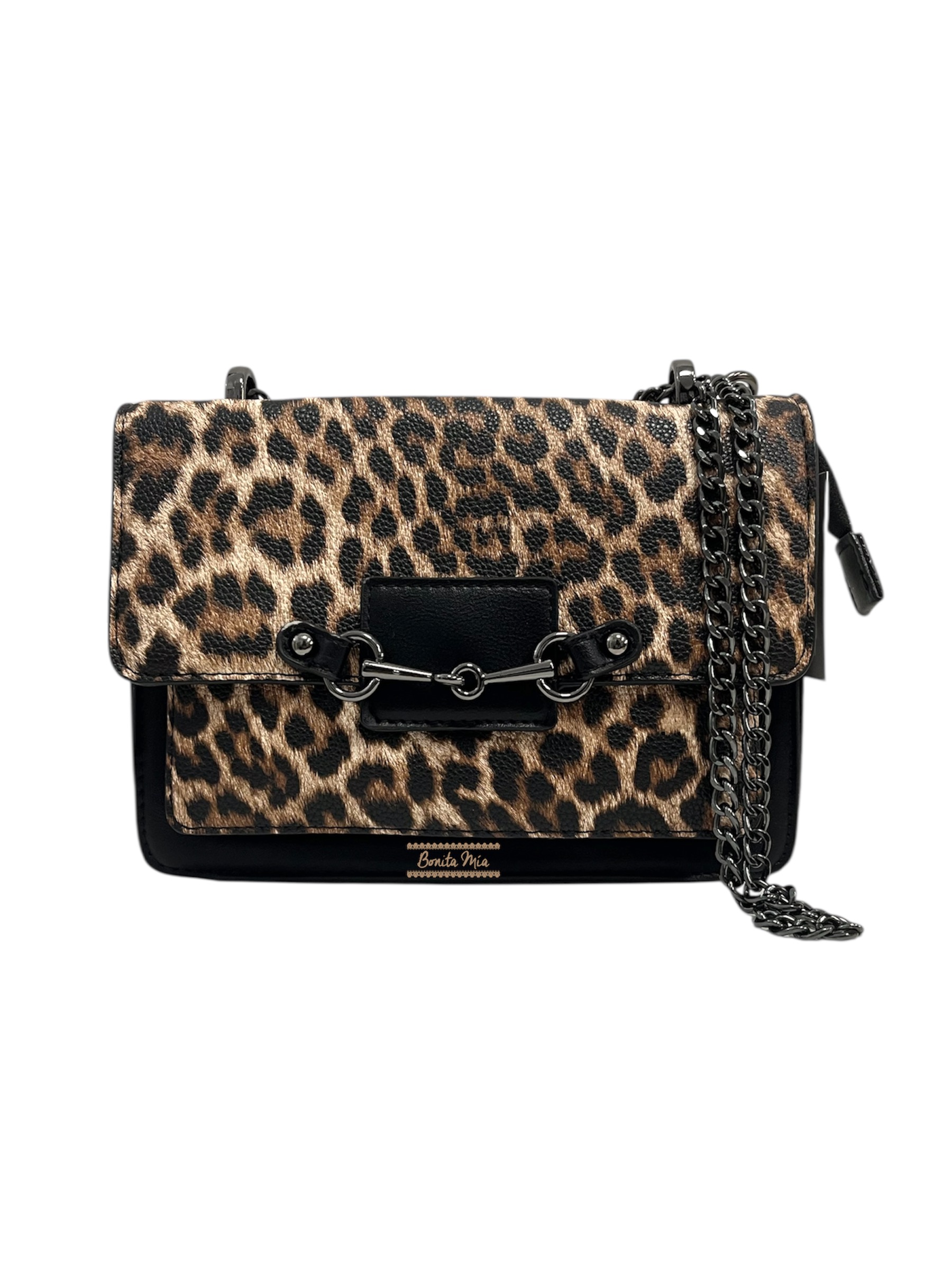 Bolso negro de polipiel rectangular con estampado de leopardo. Cadena en color plomo y polipiel negro.