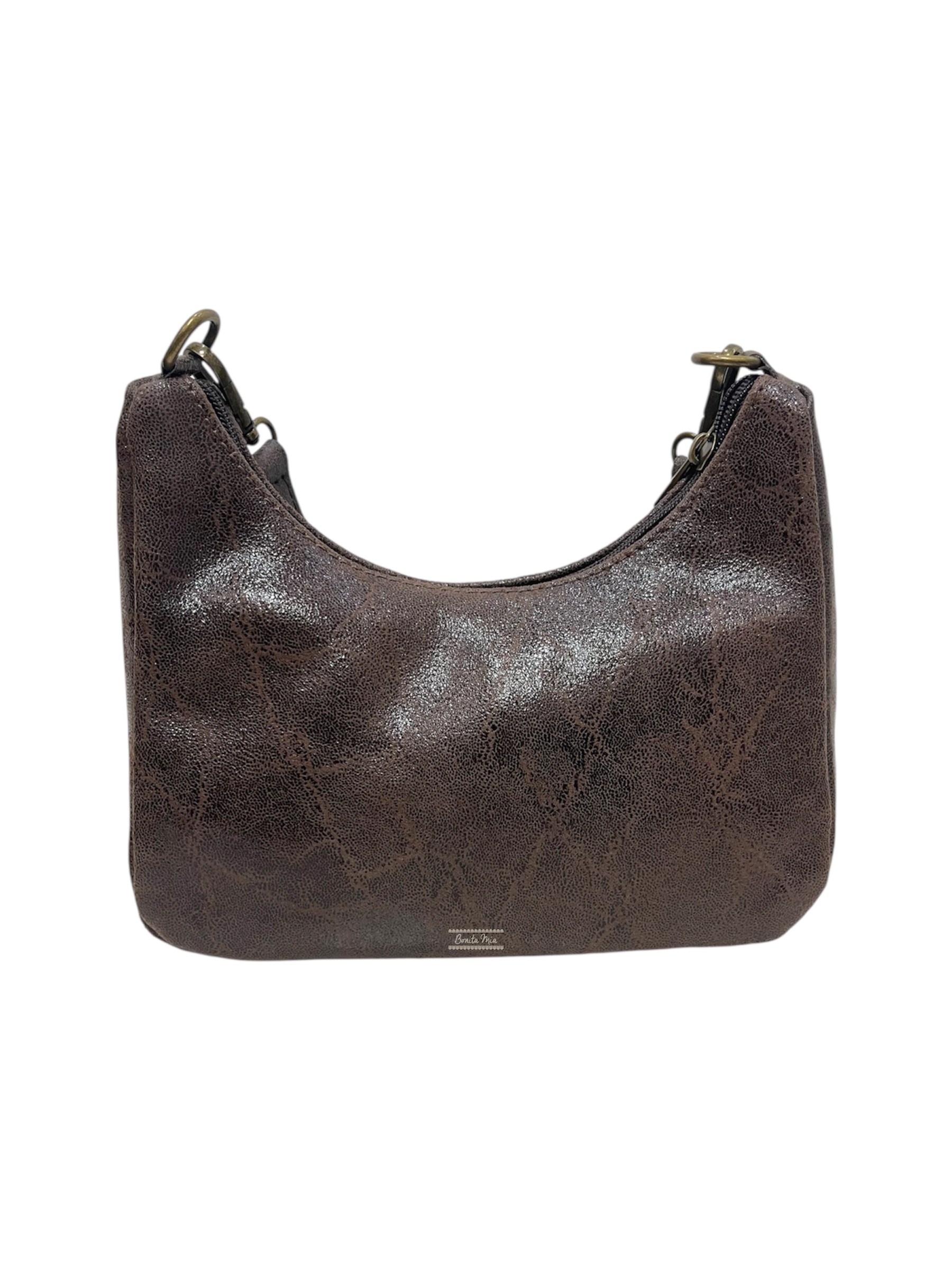 Bolso de piel estilo baguette en color chocolate de serpiente con tachuelas en tono dorado en la parte delantera.