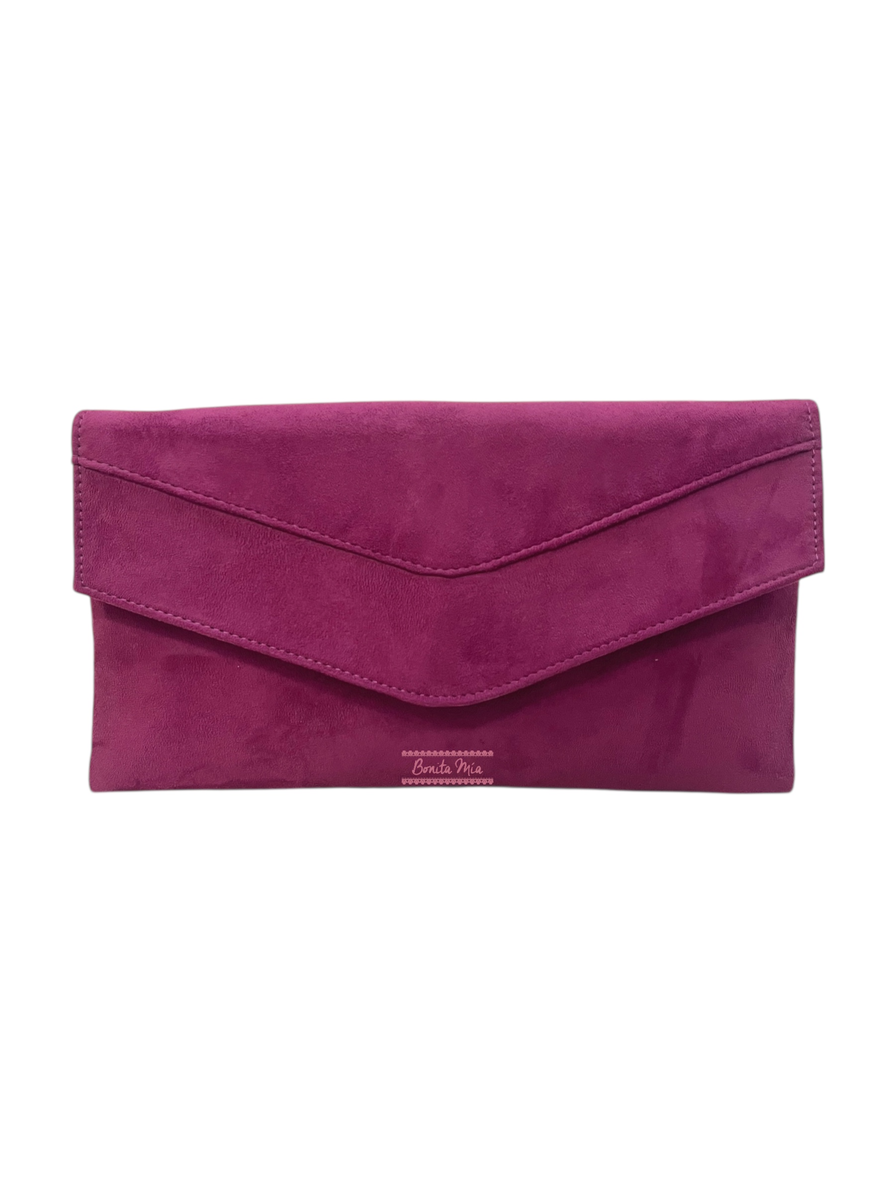 Bolso de fiesta estilo sobre en color buganvilla. Incluye cadena para colgar en tono dorado. Tejido tacto melocotón. Tipo de cierre: imán.