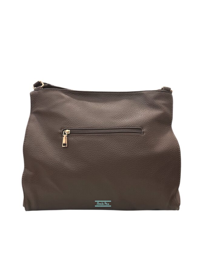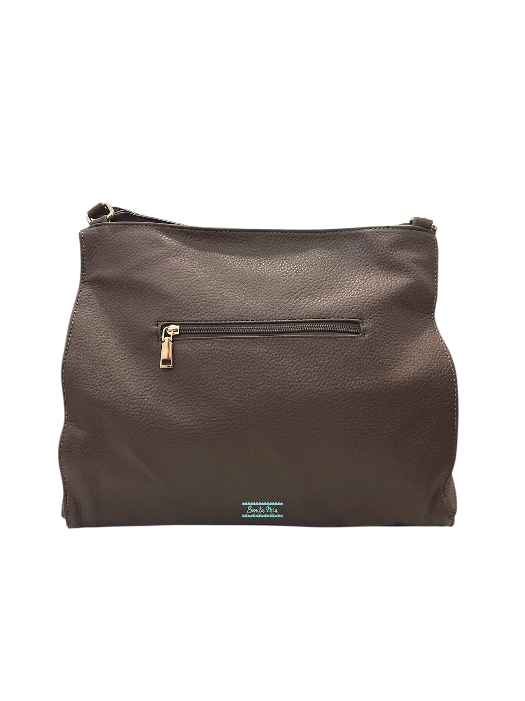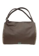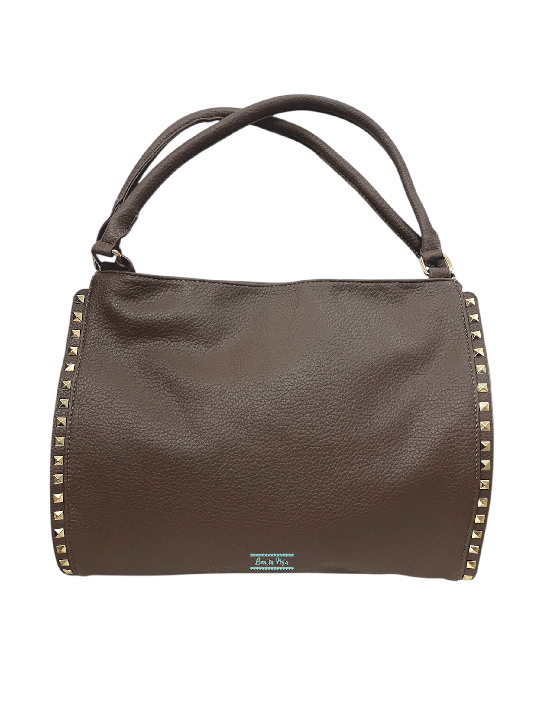 Bolso de polipiel marrón chocolate estilo shopper con tachas doradas. Incluye click en los laterales