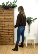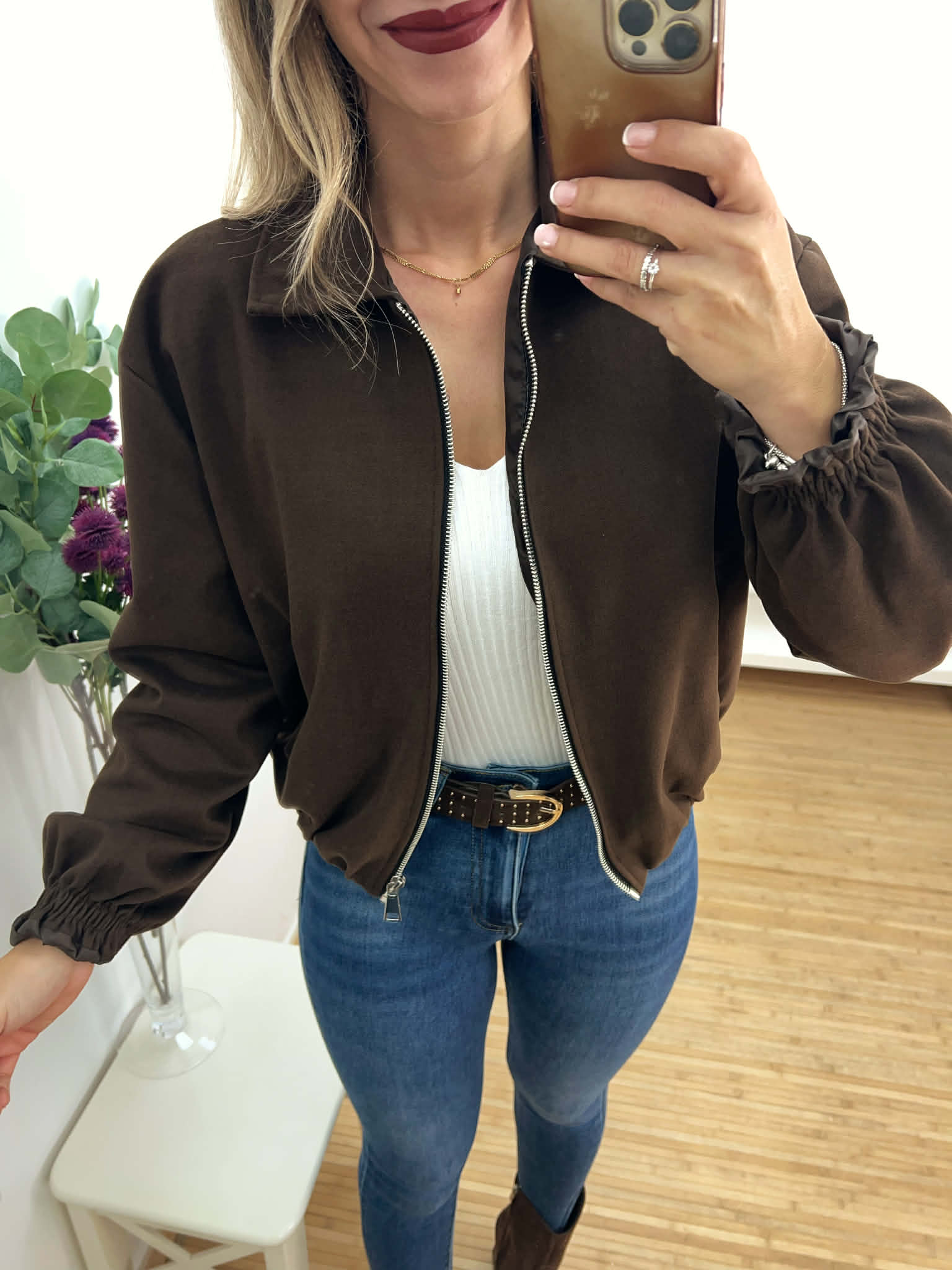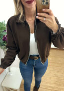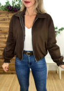 Bomber de antelina marrón chocolate con cremallera, bolsillos y forro interior. Lleva goma en cintura y puños.