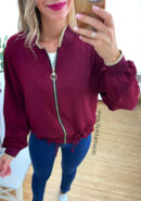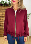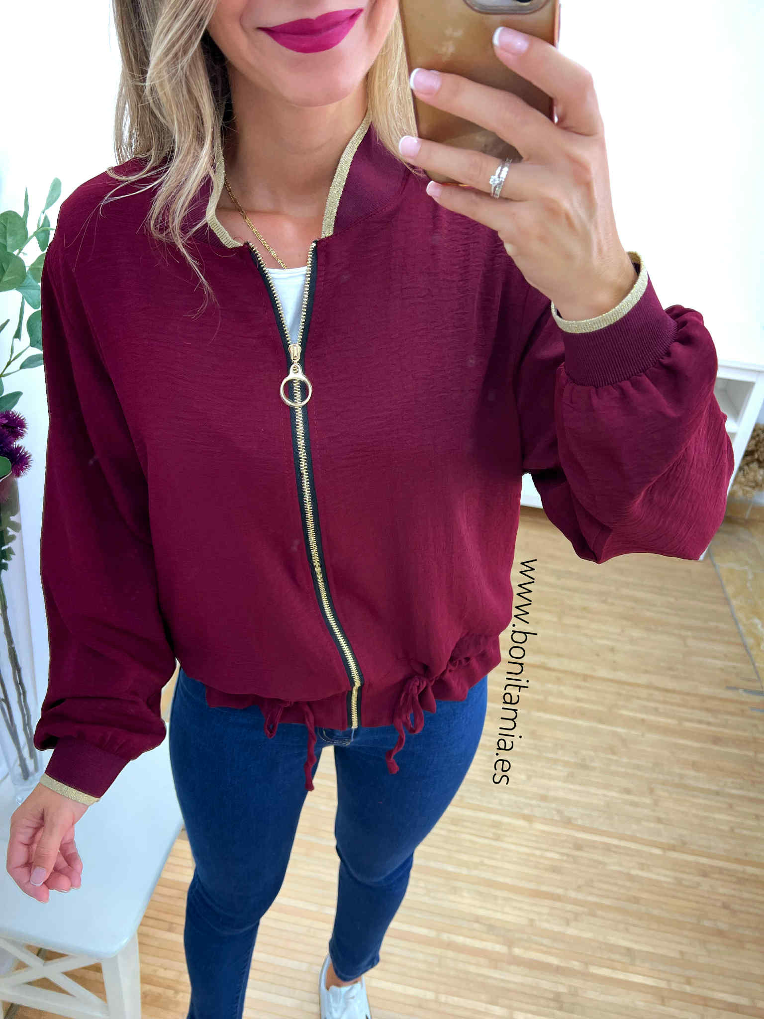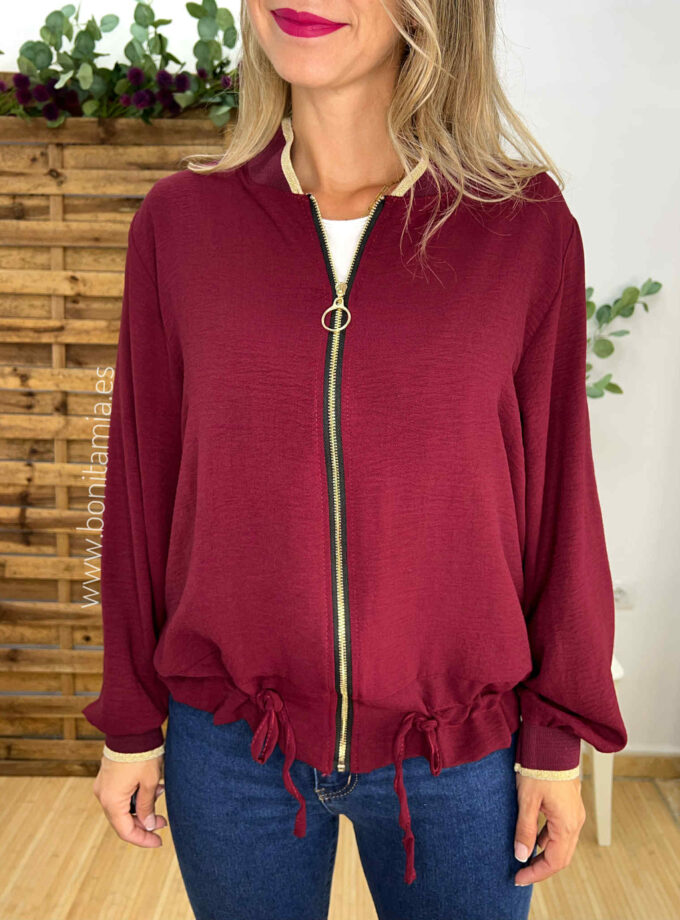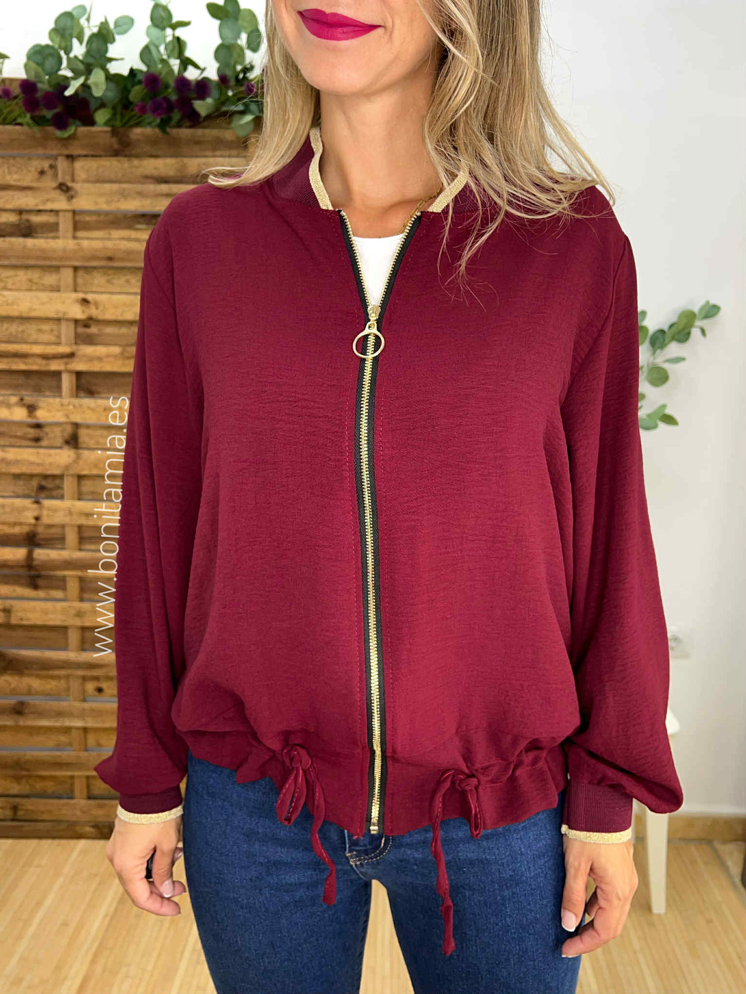Bomber fluida burdeos con detalle de hilo dorado y lazada en la cintura para ajustar.