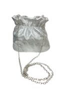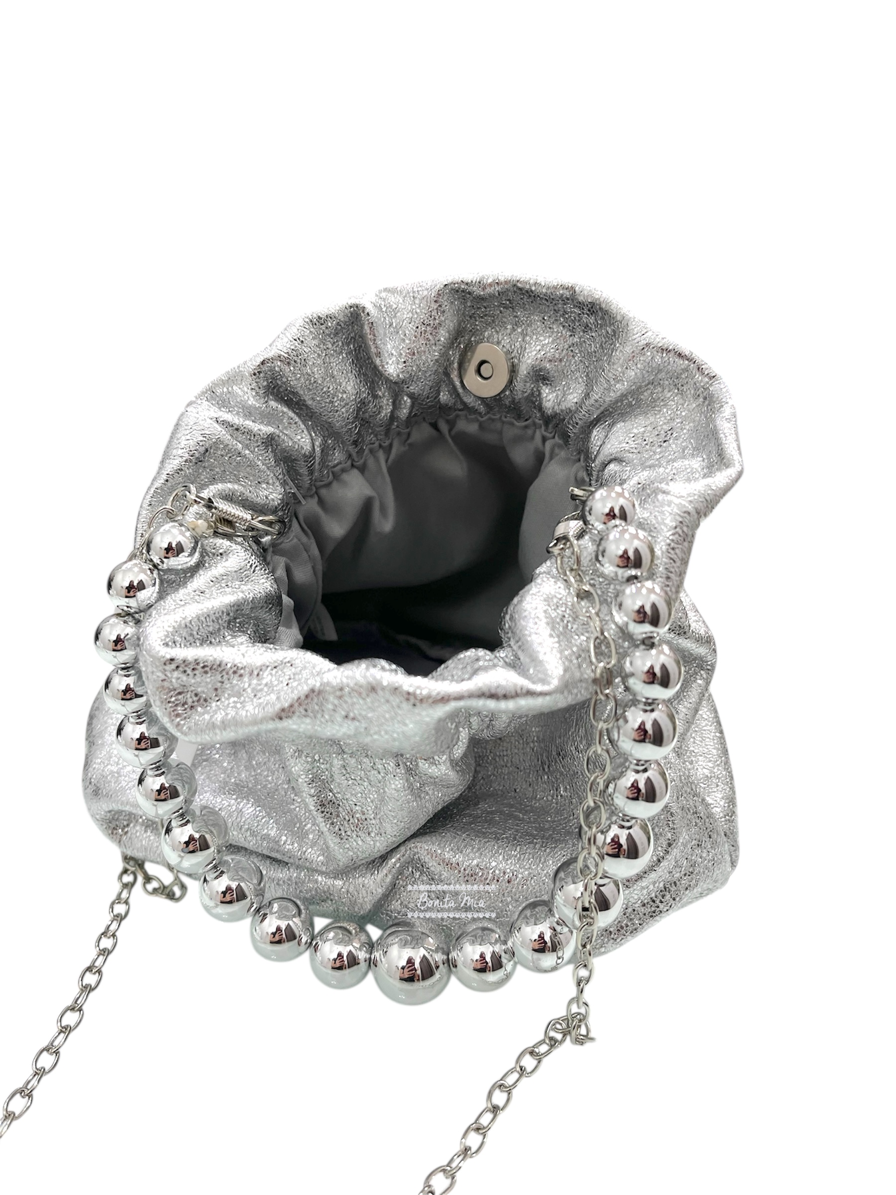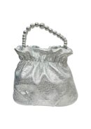 Bolso de fiesta tipo bombonera plata con detalle de asa de abalorios. Cierre de click.
