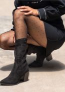 Bota negra de antelina estilo cowboy con tacón cuadrado y cremallera en el lado interior.