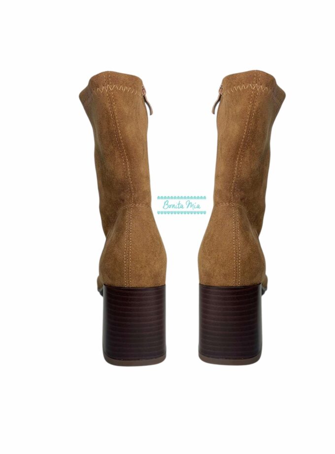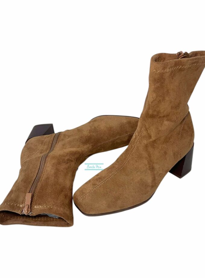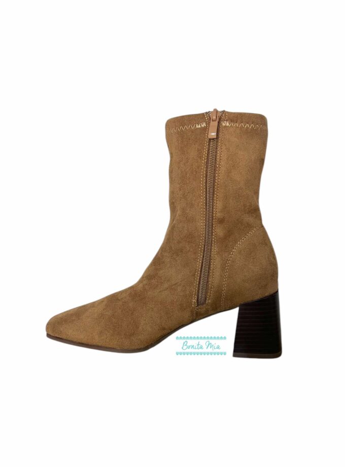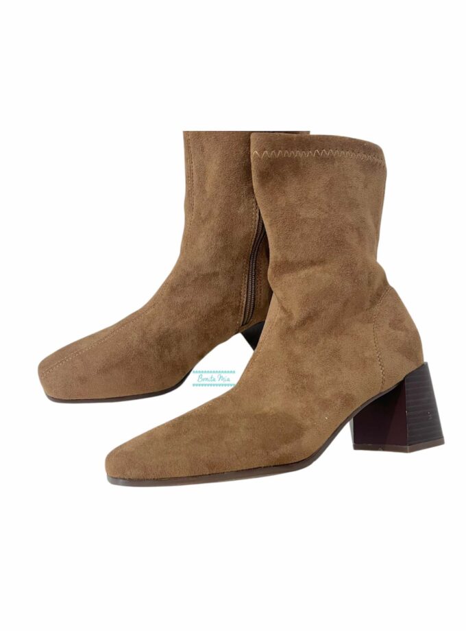Botín con tacón en color camel de antelina y punta cuadrada.