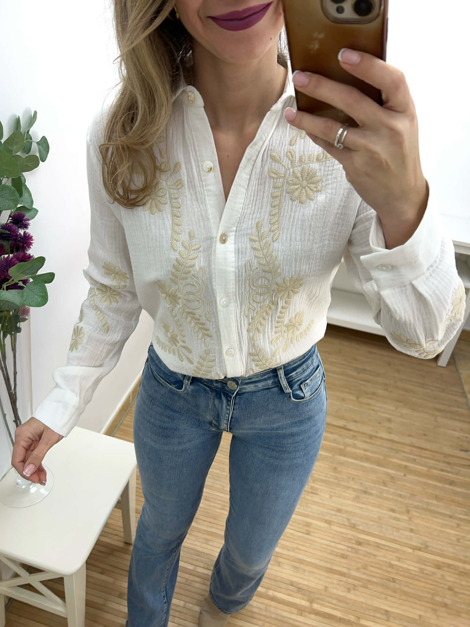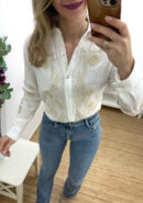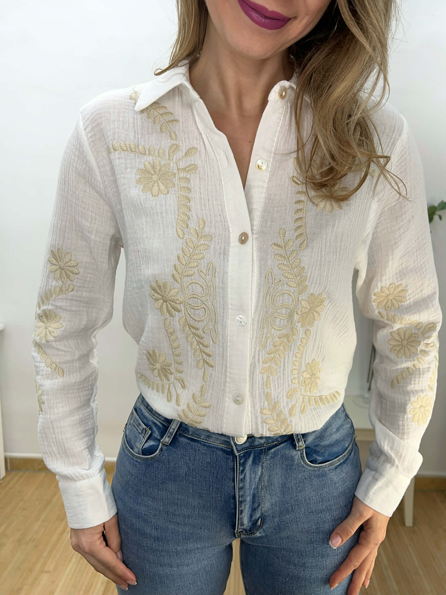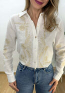 Camisa blanca de algodón con bordado floral en beige, solapas y botones.