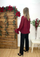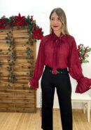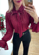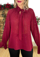 Camisa de gasa burdeos con brillo plateado y lazada al cuello. Lleva goma en los puños.