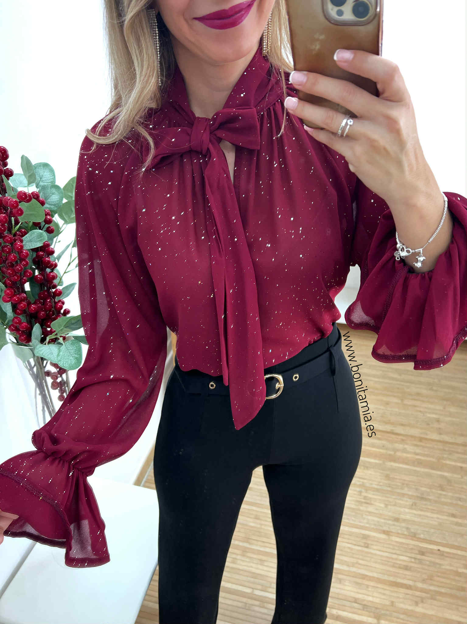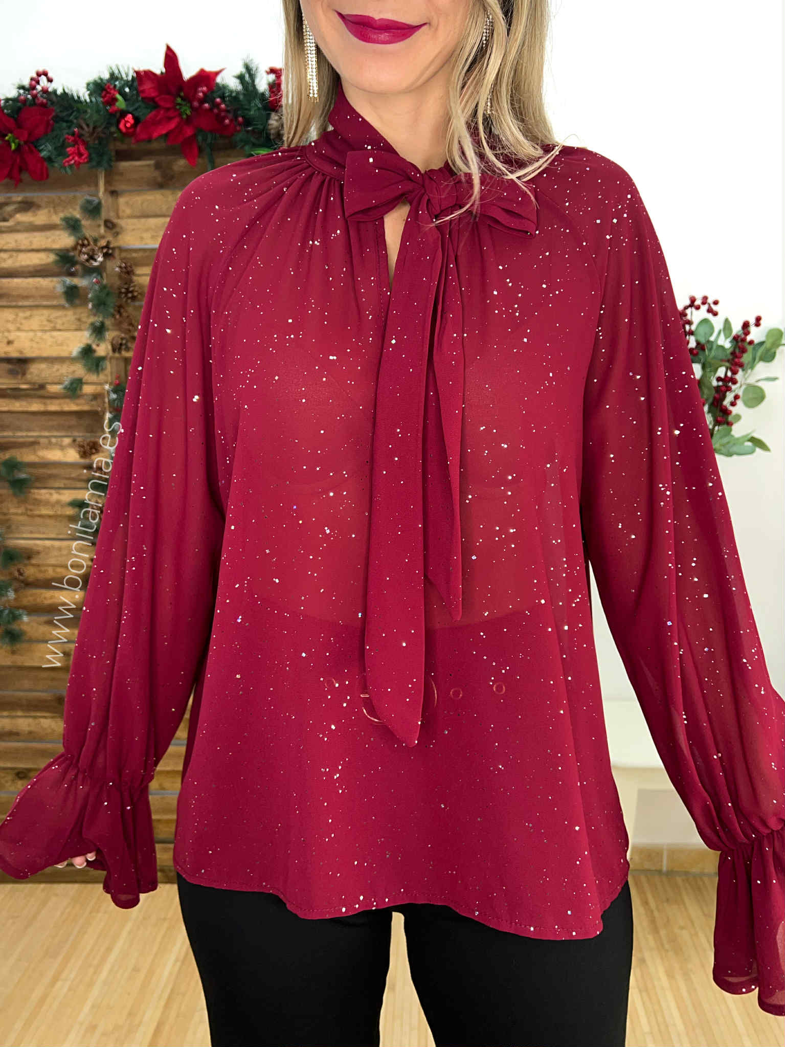 Camisa de gasa burdeos con brillo plateado y lazada al cuello. Lleva goma en los puños.