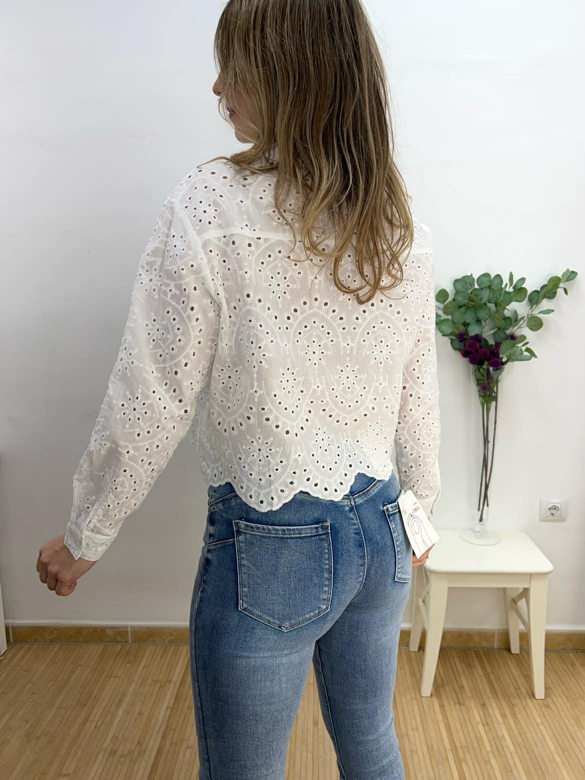 Camisa crop blanca estilo batista con solapas y botones.