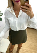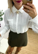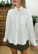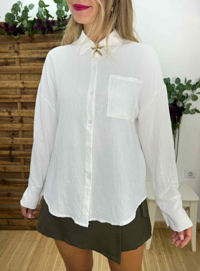 Camisa fluida blanca de manga larga con detalle de bolsillo y broche de estrella dorado.