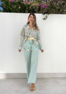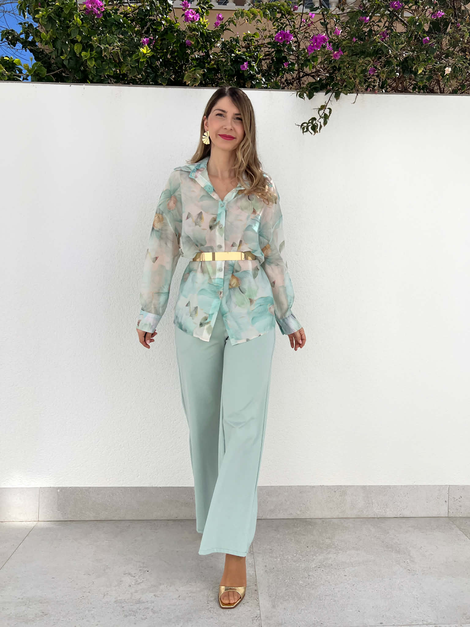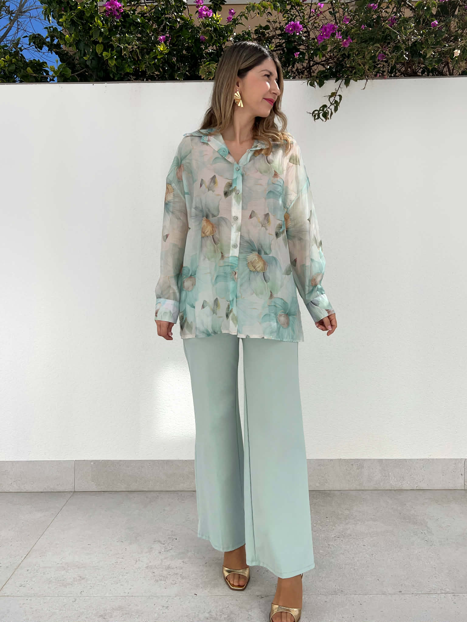 Camisa floral menta, corte clásico oversize con tejido tipo seda semitransparente que da elegancia a la silueta. Se puede usar con cinturón de aro, elástico o fajín para crear un efecto más marcado de cintura .