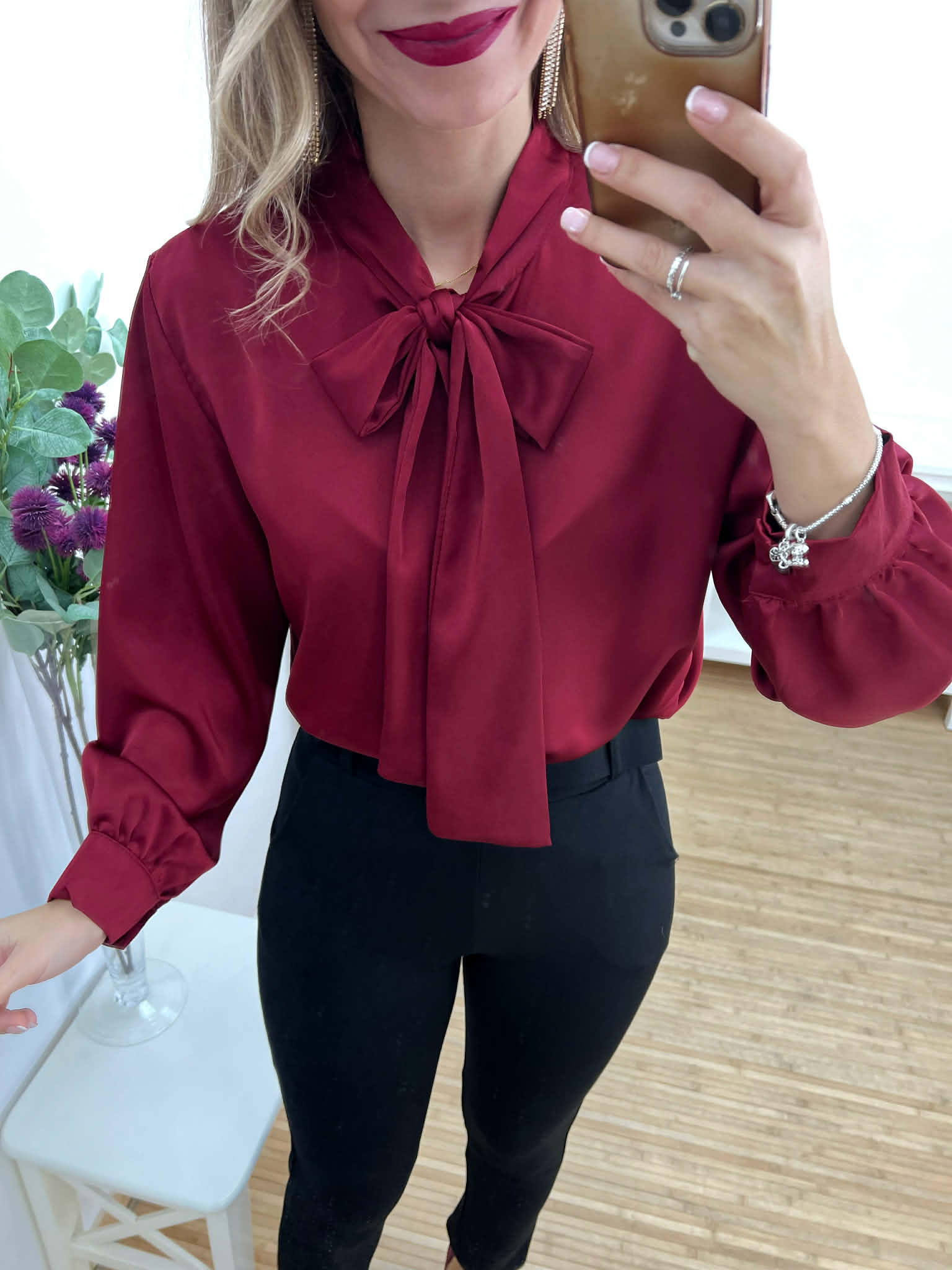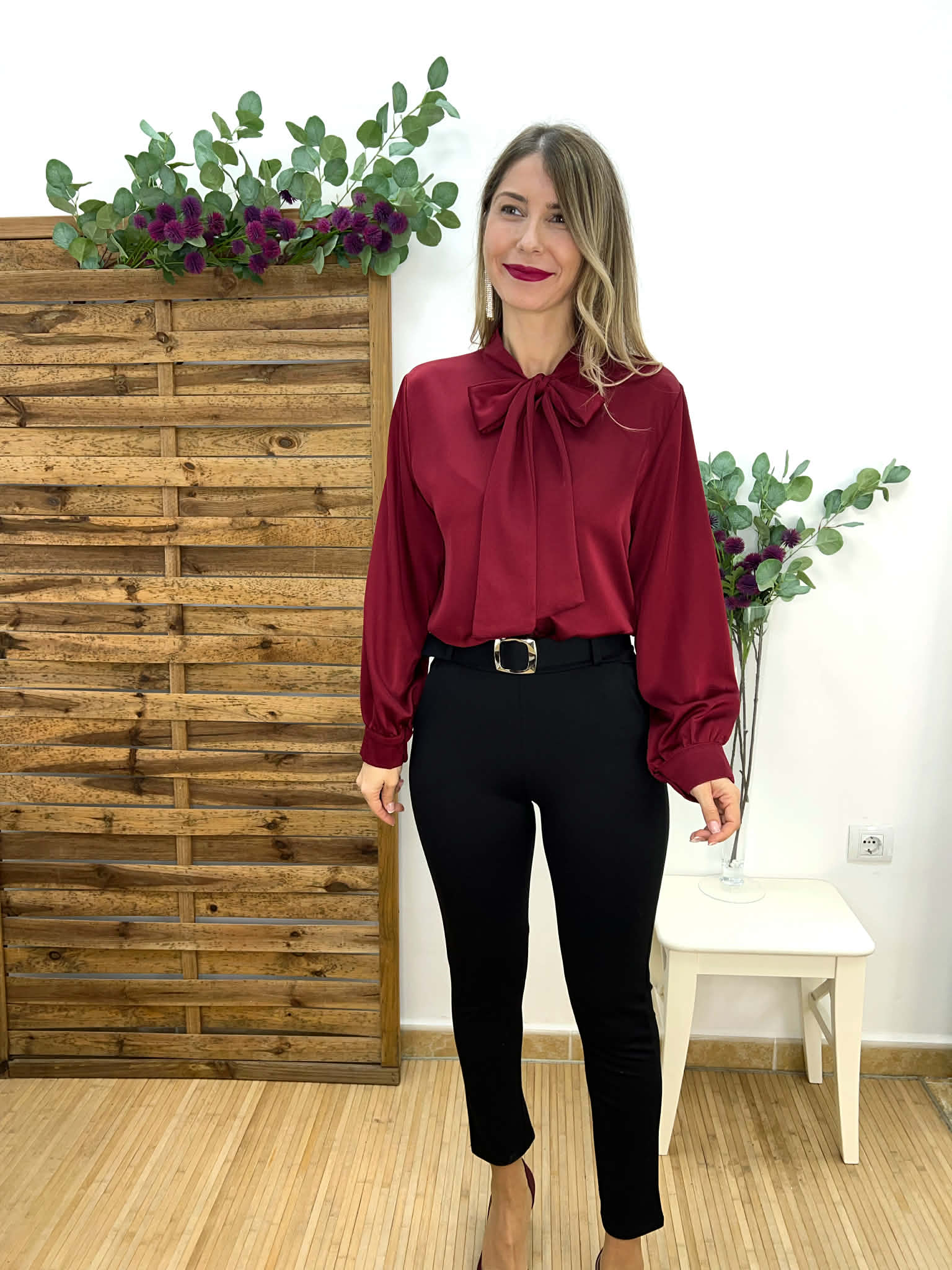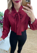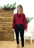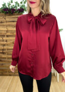 Camisa satinada burdeos oversize de botones y lazada en el cuello.