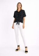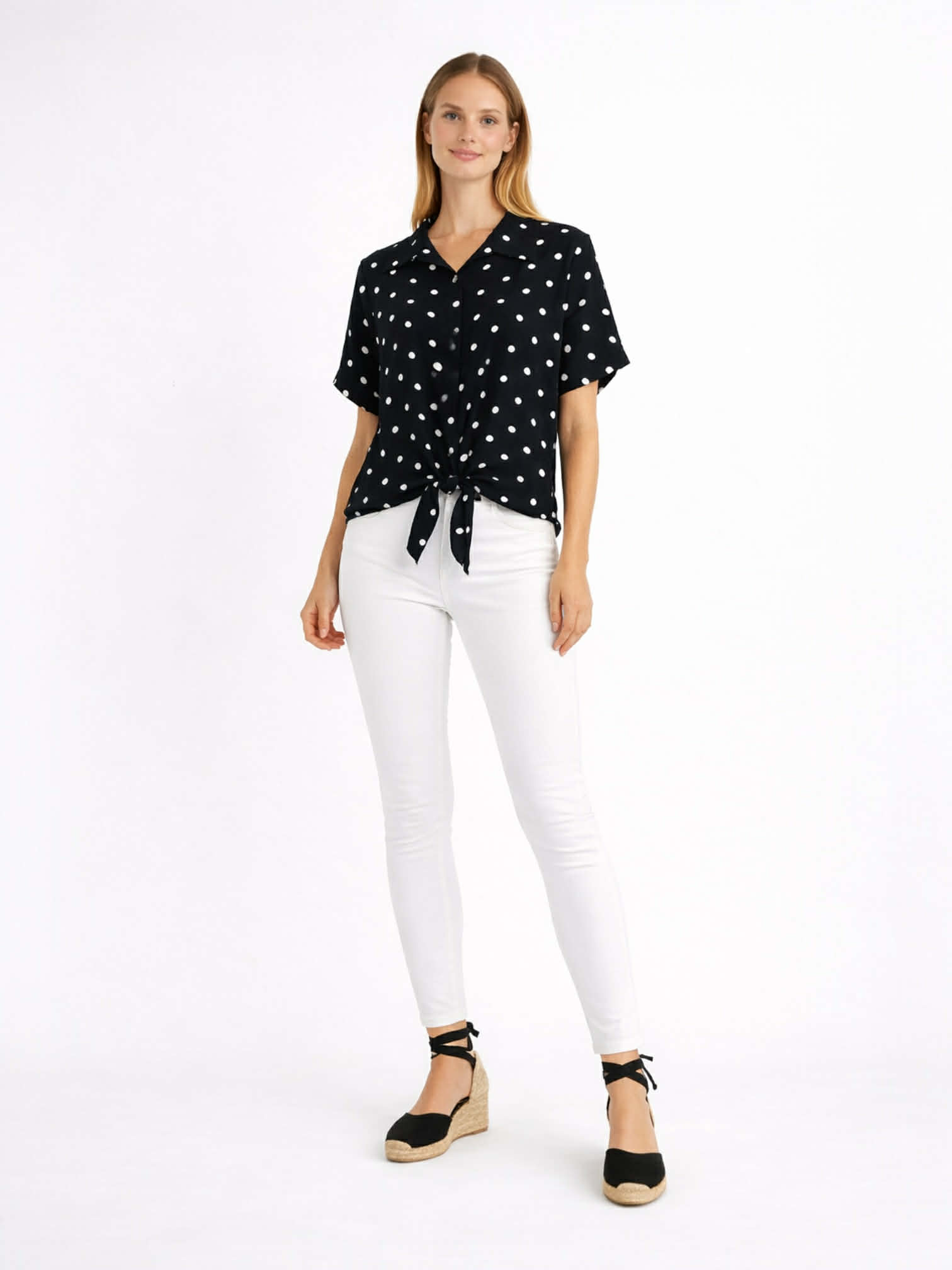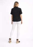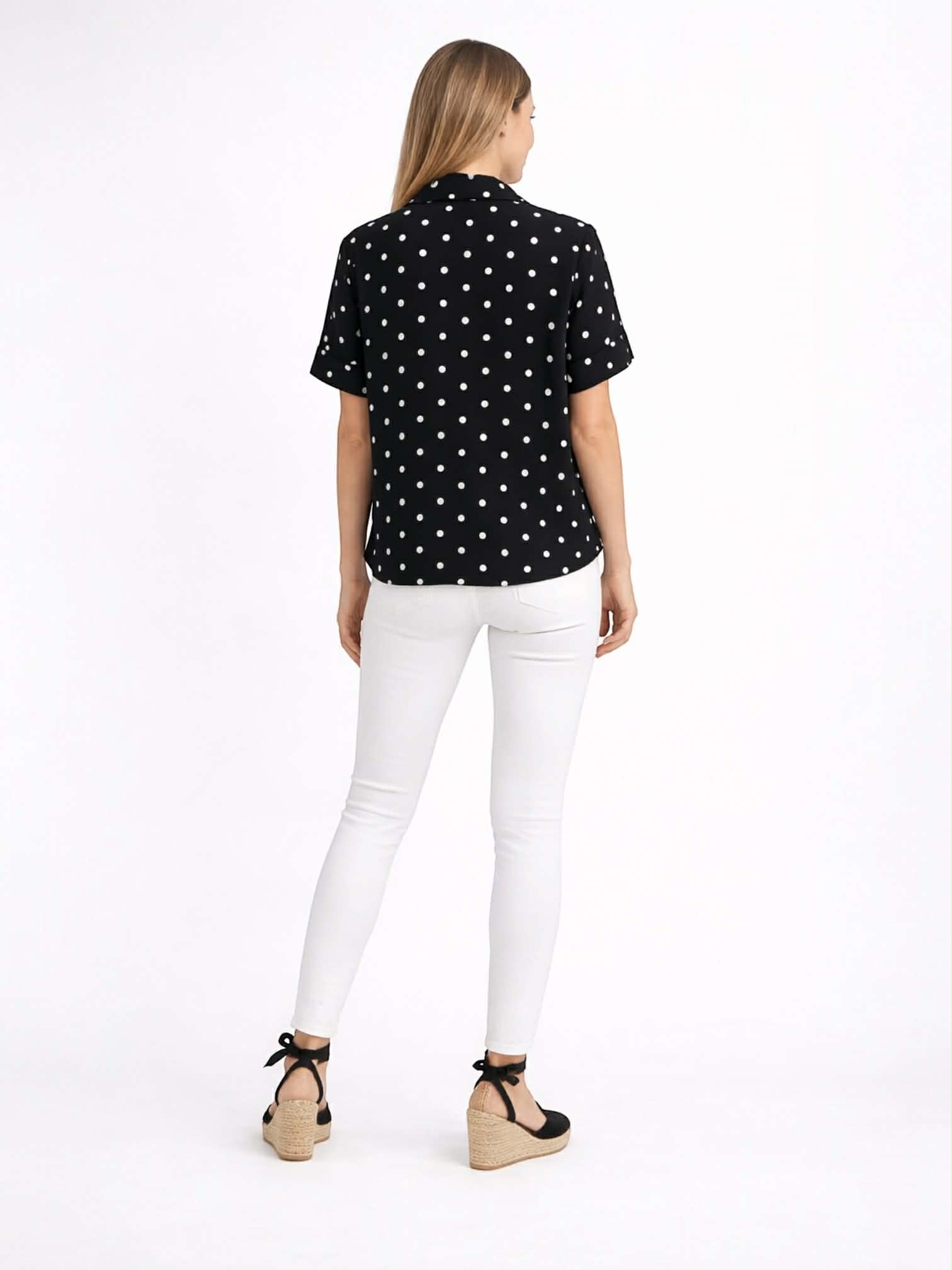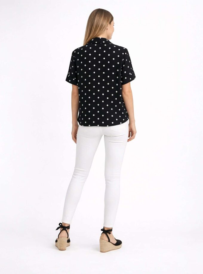 Camisa negra oversize de topos blancos con detalle de lazada.