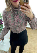 Camisa de vichy en tonos burdeos, camel y negro con volantillos y botones.