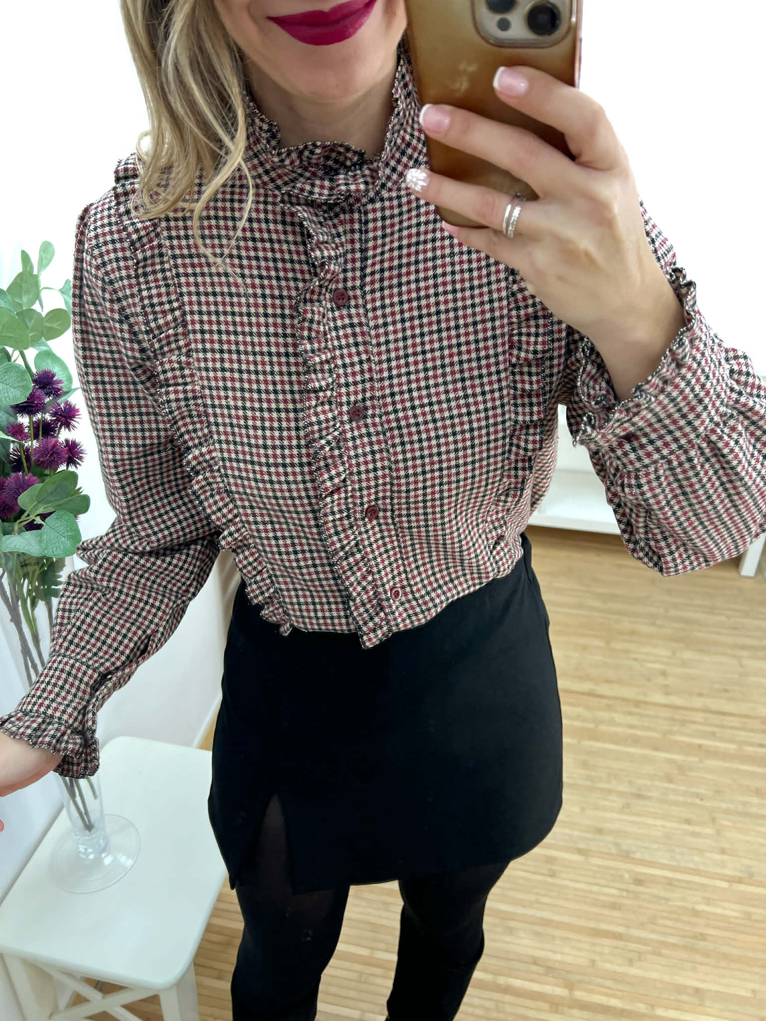 Camisa de vichy en tonos burdeos, camel y negro con volantillos y botones.