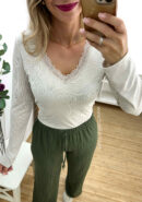 Camiseta de canalé beige de manga larga con encaje en escote.