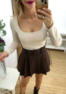Camiseta de licra beige de manga larga, escote cuadrado y fruncidos laterales. Lleva forro interior corto.